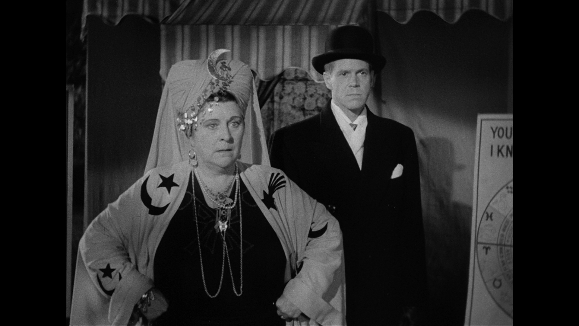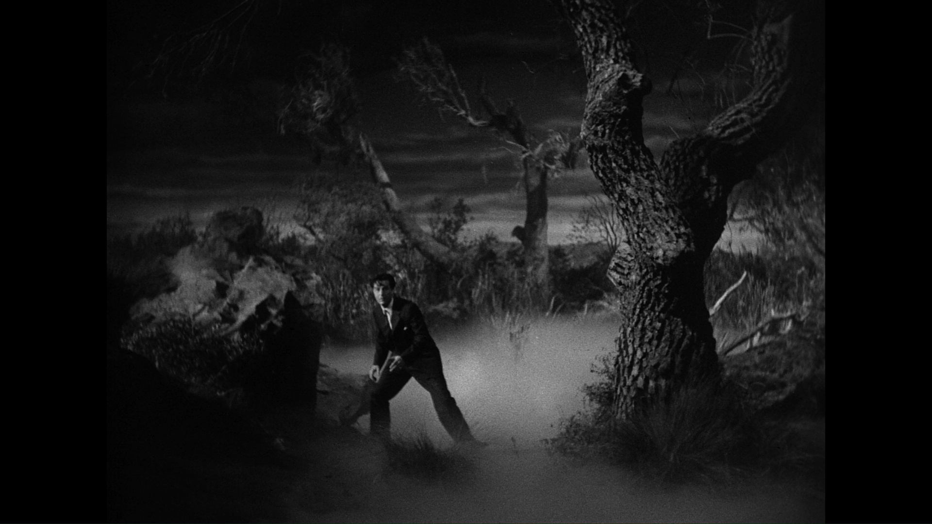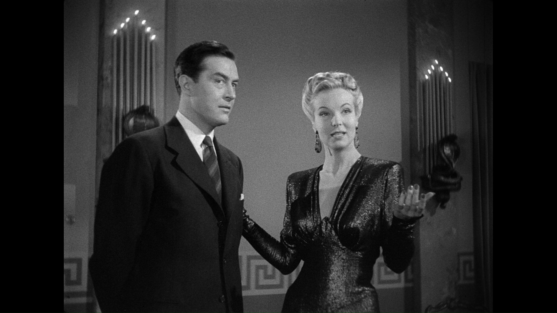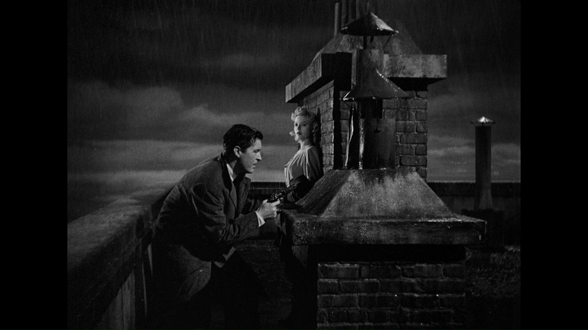 Hollywood framework. Milland is stuck with a tricky role that requires him to be somewhat disoriented and possibly mentally unstable (though far less so than the novel), so he plays it as wry and smooth as possible to keep the audience on his side -- a good tactic, as it turned out. Some nicely surreal touches are welcome, too, such as a sudden foot chase that leads into a foggy set straight out of a Universal horror film, a great seance sequence, and a flashy gun-blazing finale filled with clever ideas involving illuminated gun flashes and bullet holes.