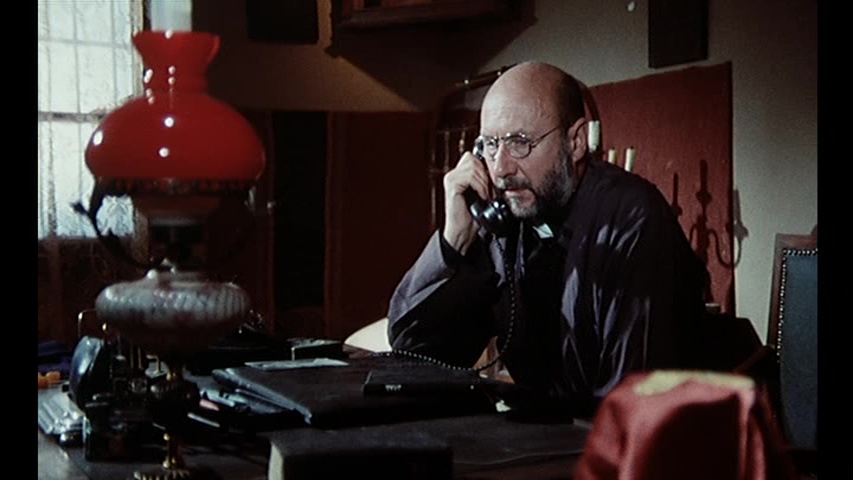 sounds a lot better, too, with a solid DTS-HD MA English 1.0 track (with optional English SDH subtitles). A very informative and sometimes quite amusing new audio commentary by critics and authors David Flint and Adrian J. Smith goes a thorough job of covering the film including its odd financing (a combination of U.S. money and, believe it or not, the famous Getty family in America), the state of international horror filmmaking at the time, the release history and alternate versions, the careers of Pleasence (including his odd Irish accent) and Cushing whose roles were originally supposed to be swapped, the joys of watching Cushing brandish a shotgun, and more. Also playable with the film is "The John Player Lecture with Peter Cushing," a 92-minute audio recording of a discussion with the actor and David Castell at London's National Film Theatre. It's very witty and packed with stories of his career starting with his early inspiration from Tom Mix movies through his progression to becoming a performer on the big and small screens in Great Britain including Hammer and beyond, as well as sojourns with Hollywood stars. In "This Life and the Next" (7m48s), producer Frixos Constantine looks back at the film including director Costas Karagiannis, the script, the decision to hire Eno, and the cast (some of whom were more pleasant than others); his accent is very thick which makes a few bits hard to make out, but it's worth a listen. Also included is the sanitized Super 8 version (93m20s) which still runs a lot longer than the American one, plus a Land of the Minotaur TV spot and trailer promoting this as "the most terrifying film of 1977" (which will come as a surprise to The Hills Have Eyes, Suspiria, Rabid, Shock, Rituals...). Finally the disc rounds out with a 29-image gallery of international photos and poster art (including a couple of shots not in the actual film), while the insert booklet features a new essay by Andrew Graves, an archival interview with Pleasence, highlights from the PR campaign, and critical reactions.