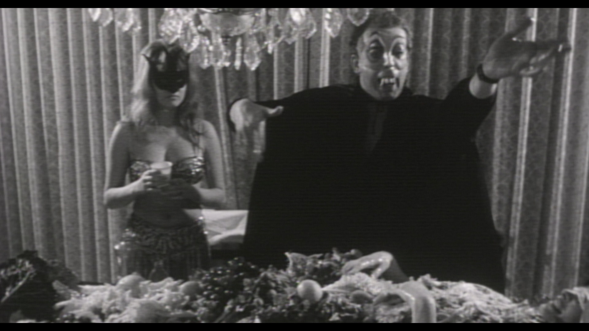 As the gimmicky opening narration informs us over footage of metamorphosing and combustible skulls, the film takes place at the border between "pure fantasy" and "cold reality" with the viewer left to decide which portions fall on either side. From there we follow a loose collection of sequences involving highly dysfunctional Howard (Moriarty), a serial rapist prowling the streets of L.A., and his strung-out wife, Vicky (Common Law Cabin's Rein), who lives in a state of constant sexual arousal. Over the course of one evening their private lives start to intersect when they end up going to the same masked party where everyone gets down to their underwear, plays around with food a lot, splashes around in the pool, and indulges in some moderate S&M. Along the way you also get to see a grubby sex film production in action (courtesy of Howard's day job) along with whatever random strangeness the filmmakers happened to capture, but it's really the climactic, protracted party scene (complete with Lamb shooting underwater in a swimming pool) that will leave you reeling.