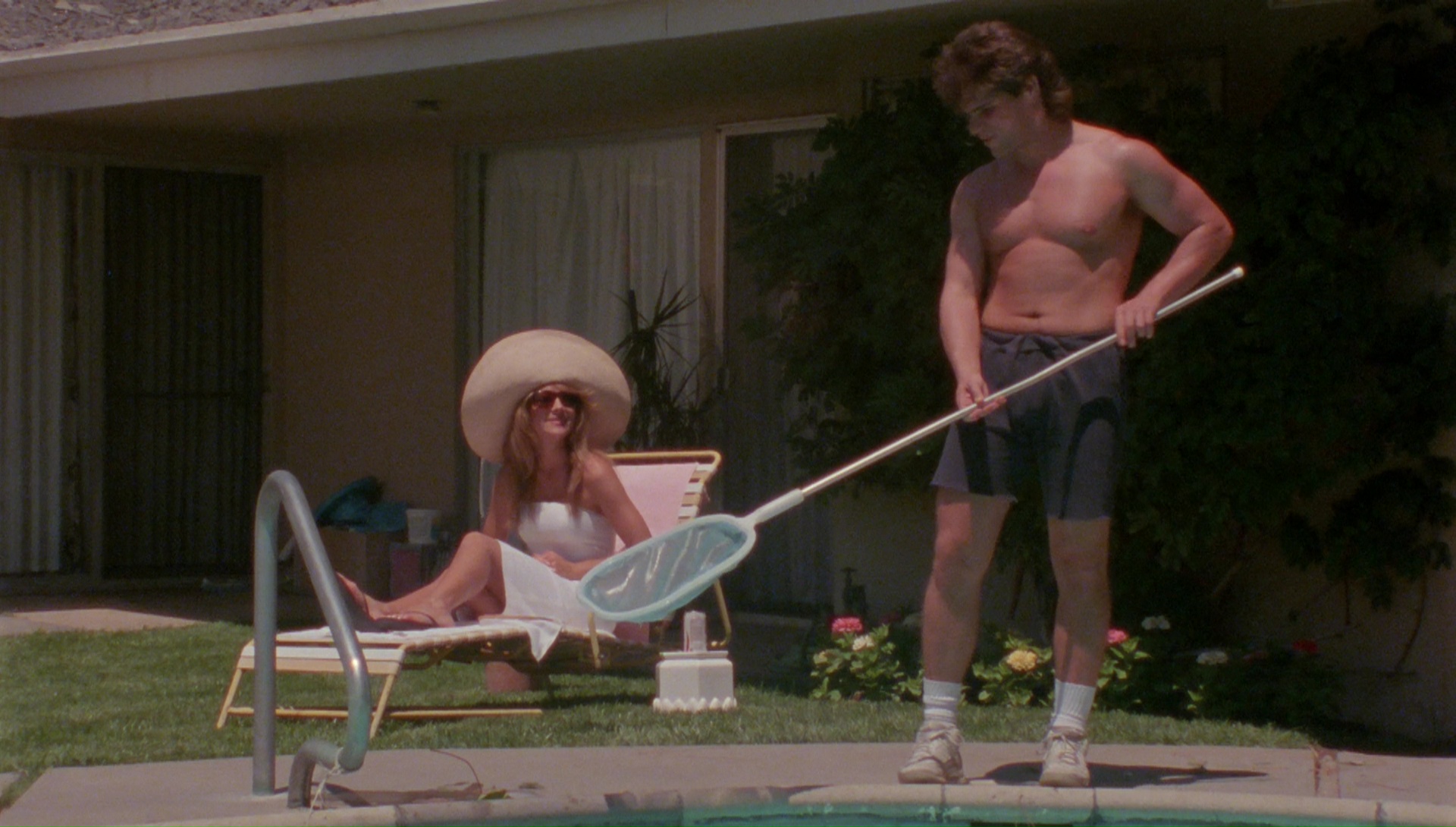 Just as skin-filled but much lower on the blood quotient, Deadly Embrace compensates by amping up the weird quotient for the story of pampered SoCal housewife Charlotte Moreland (Caged Fury’s Miller, billed as “Ty Freeman”), an incessantly horny and voyeuristic lady who enjoys watching guys through the one-way glass in her guest room closet. She’s married to the inattentive Stewart (Vincent), who’s distracted by an affair at the office, so instead Charlotte turns her attentions to Chris (current reality show editor Abraham), the handyman and gardener who hangs around the house far longer than his work shift and tempts her by the pool when he isn’t busy making phone calls to his girlfriend (Quigley). The whole thing is framed with police interviews (with no faces shown) so we know it all ends badly, and boy, does it ever.
