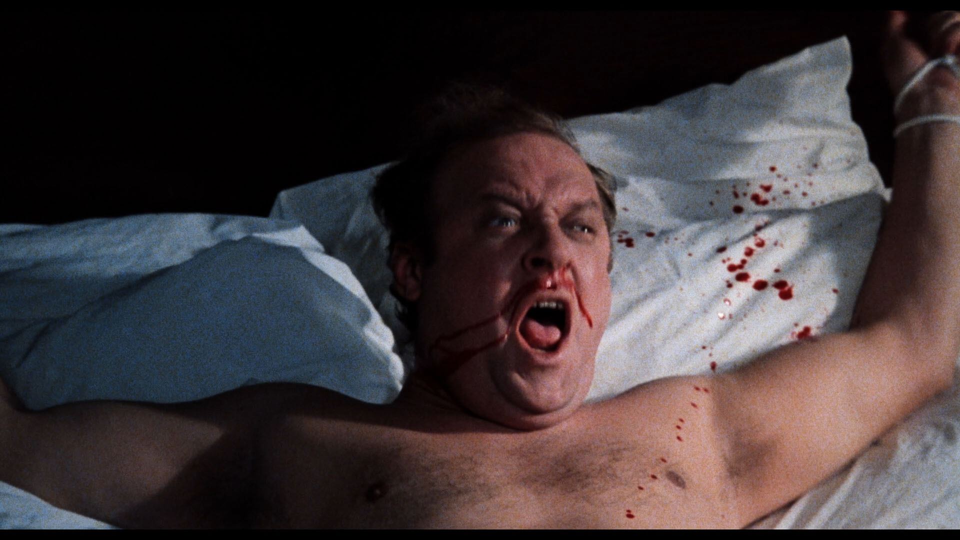 Knowing how much of a fascination with video nasties has been held by Severin since the label's inception, it shouldn't be a surprise to have that as the focus of the second Blu-ray headlined by Damaged: The Very British Obscenity of David Hamilton-Grant (71m44s), a feature-length look at the completely bonkers history behind the distributor whose sexploitation background and dubious professional ties culminated in his prison stint over this film. It's a wild saga including runs from the law, drugs, censorship, porn, naughty animation, and his presumably gangland-connected demise (or was it?), with participants like Vic Pratt, Brendan Price, Francoise Pascal, Cherri Gilham, Kate Egan, David Flint, Marianne Morris, David McGillivray, Fiona Richmond, Antony Ginnane, and film professor Julian Petley, with narration by Jack Davenport(!). Great stuff, and it comes with optional English SDH subtitles. Also on the disc are four of Hamilton-Grant's short productions: The Office Party (53m50s), a typical 1976 softcore sex comedy, scanned from a decent print in HD and framed at 1.66:1; 1975's Under the Bed (52m16), one of several softcore romps with John Hamill (Tower of Evil), here pulled from SD video; 1978's You're Driving Me Crazy (53m10s) featuring Suzy Mandel and charting the comic misadventures of an au pair hired to chauffeur a guy given a DUI, pulled from film and shown at 1.66:1; and Escape to Entebbe (8m132s), a baffling 1976 spoof short with The Vicar of Dibley's John Bluthal in brownface as a Pakistani reporter interviewing Idi Amin.