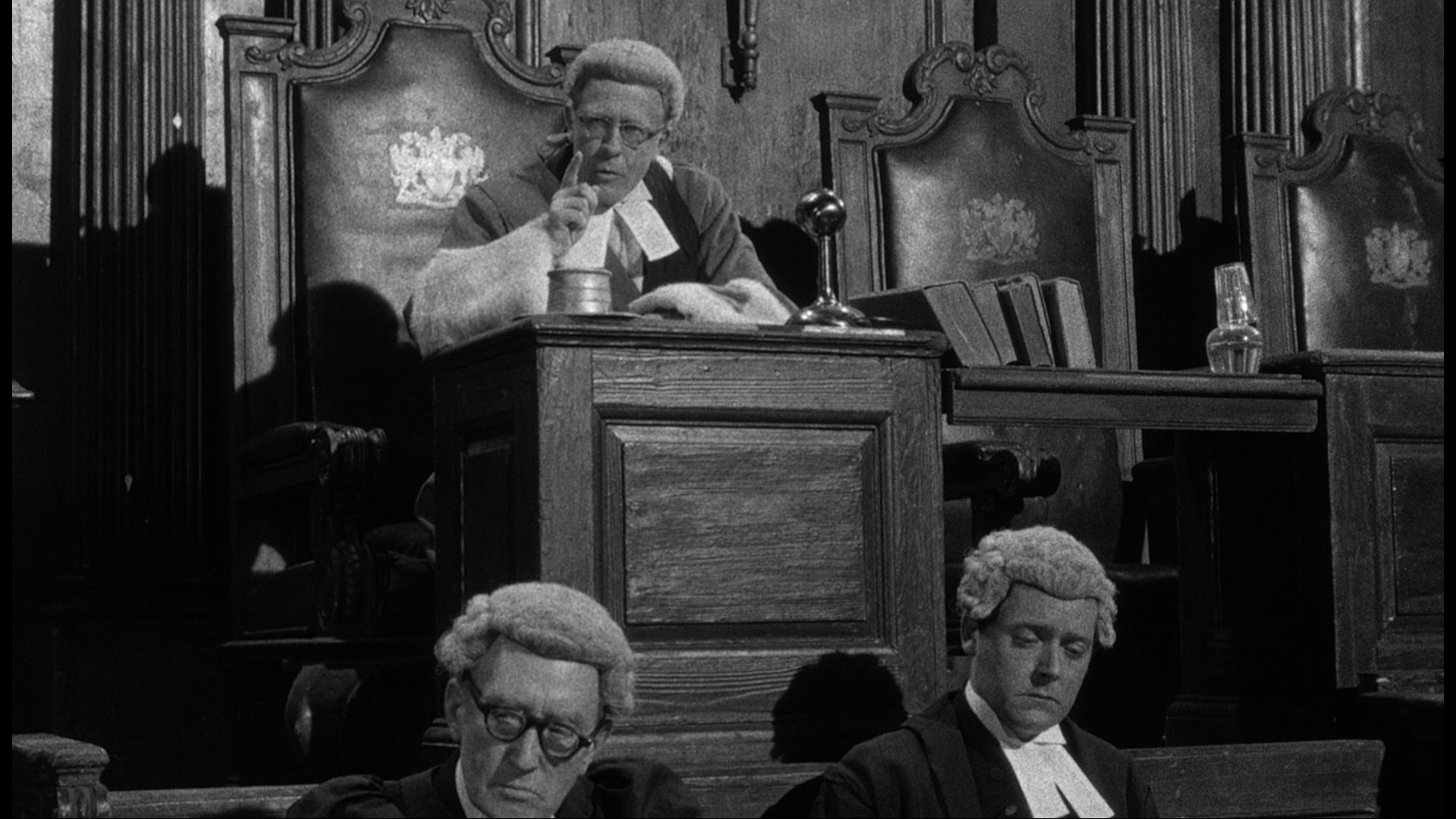 after languishing in oblivion for ages apart from the occasional sparse TV airing, and the Sony master is also in fine shape retaining the inherently grainy, textured aesthetic of the film. A lively audio commentary by Barry Forshaw and Kim Newman is up to their usual high standards as they dive into the belated critical appraisal of Fisher among English-speaking critics, his early days in films like this, the backgrounds of Conway and the other players, the reasons this may have gotten by with the BBFC compared to what the Production Code inflicted on films like Rebecca, some major variations from the source novel The Jury by Gerald Bullett, and even a Lady Gaga reference that's actually justified. The film can also be played with "The Guardian Lecture with Ivor Montagu," a 1977 archival audio recording of a lecture by the screenwriter at London's National Film Theatre covering 20th-century Russian history and film, Lenin, and quite a bit about Sergei Eisenstein and the perception of reality via depictions in cinema. Film Fanfare No. 5 (4m48s) is an amusingly staged 1956 silent (with music) British Pathé newsreel featuring a contest winner visiting the set of this film and meeting the cast and crew, including hanging out on the courtroom set, getting smooched by Conway for some reason, and glamming up in the make-up chair. A 38-image gallery