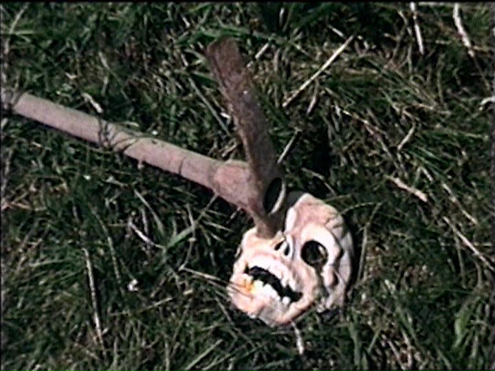 The plot concerns a masked guy in the woods who likes to kill people. And that's about it. The director pseudonymously plays the title psychopath, who likes to make blood soup and chomp on cannibal dinners in his lonely delapidated house out in the middle of nowhere, and no one who runs afoul of him is safe, even little kids or inanimate vehicles. Heads get lopped off. Arms roll in the grass. He also likes to grind his axe against his crotch in front of centerfolds plastered on his wall, which is definitely a movie first. Eventually things take a truly crazed turn when we find out there's also something supernatural on the premises, which leads to an undead melee with an appearance by Jess Franco regular Howard Vernon, of all people.