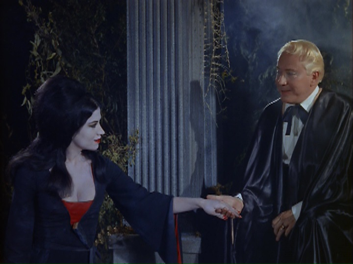 road down a small cliff. They're welcomed to a nearby cemetery by Criswell and his Vampira-styled, beehive-wearing sidekick (Silver), who subject them to ten summonings of cursed women beneath the full moon. What ensues is basically a string of topless burlesque routines involving a greedy woman dipped in gold (Barrington again in a wig) and numbers titled the Hawaiian Dance, the Skeleton Dance, the Slave Dance, the Street Walker Dance, the Fluff Dance, the Mexican Dance, and the Zombie Dance. Along the way, the provocative Silver starts jonesing to sink a knife into the human couple before their time to join the realm of darkness comes at dawn, and a werewolf and mummy show up to deliver wisecracks and tie the couple up for some added kink value. It all ends with a little twist ending, though it probably isn't the one you think.