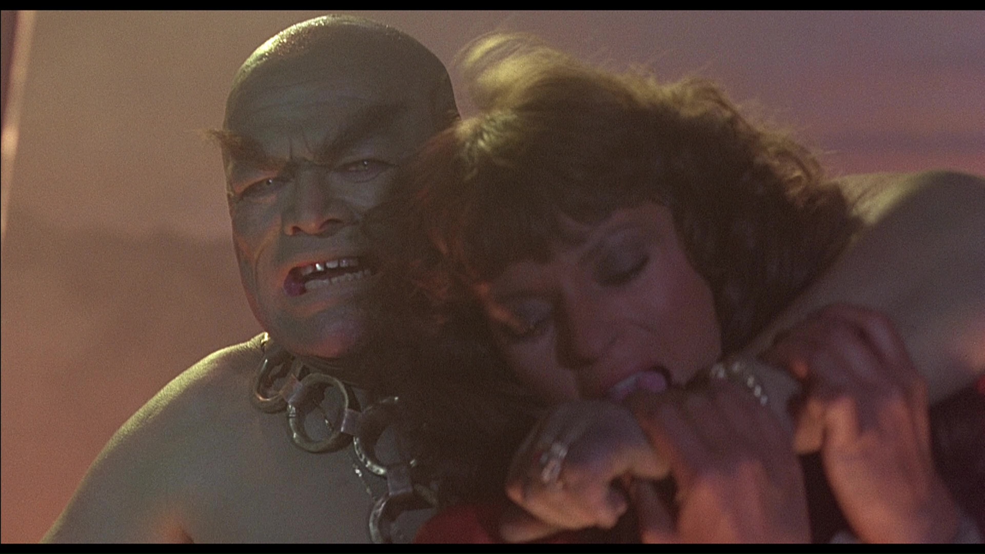 Patrick Wayne (son of John and star of the same year’s Sinbad and the Eye of the Tiger) takes leading man duties here as Ben McBride, a Major in charge of leading an expedition into perilous uncharted territory to track down his friend and the previous film’s now-missing hero, Bowen Tyler (McClure), who’s left behind a mysterious note in a bottle about his whereabouts since his adventures on Caprona. Accompanied by plucky news photographer Charly (Superman II’s Douglas), manly mechanic Hogan (Rimmer), and seasoned biologist Norfolk (Walters), Ben locates the island that may hold the secret to Bowen’s whereabouts – but what they don’t count on are aggressive dinosaurs, a tribe of natives, a sexy prehistoric girl named Ajor (Gillespie) who practically communicates with her cleavage, and a fiery volcano begging for fresh sacrificial victims.