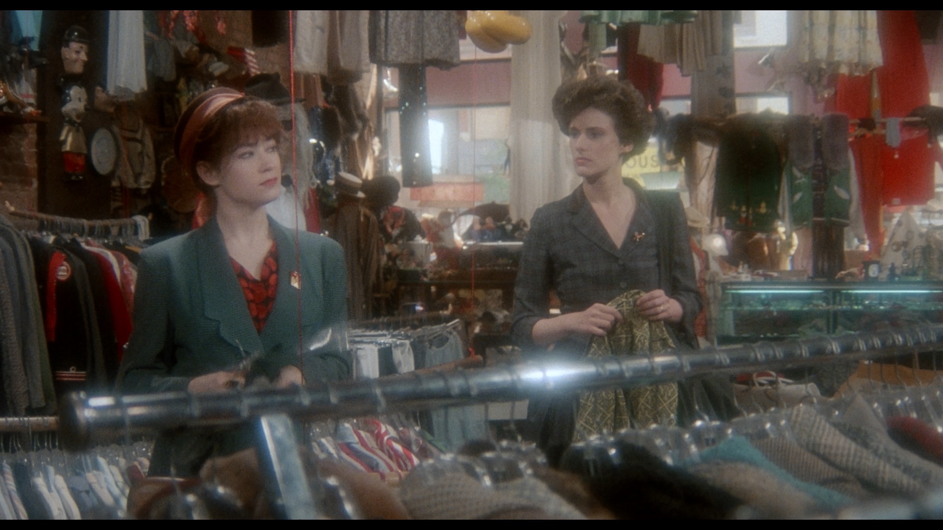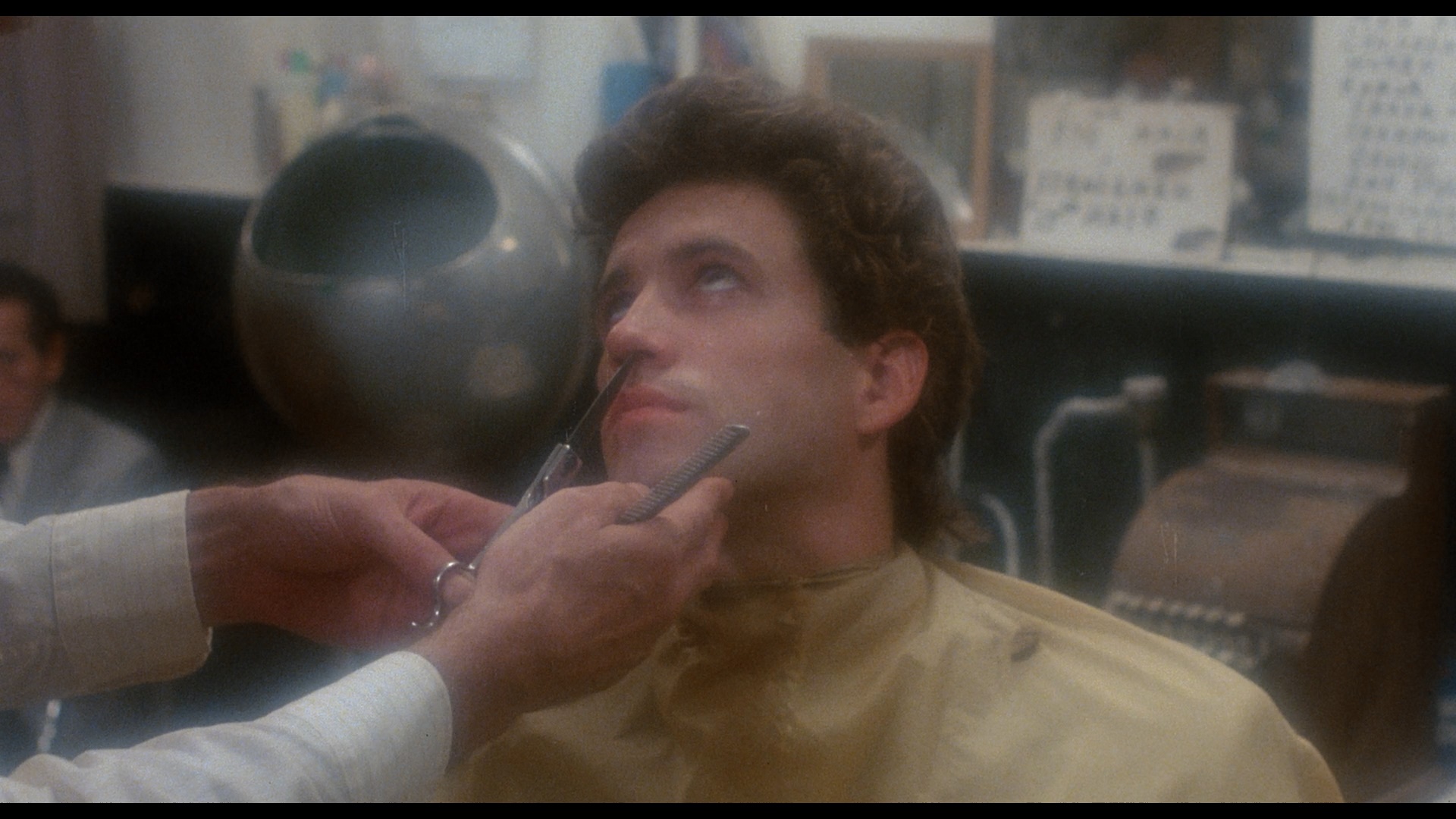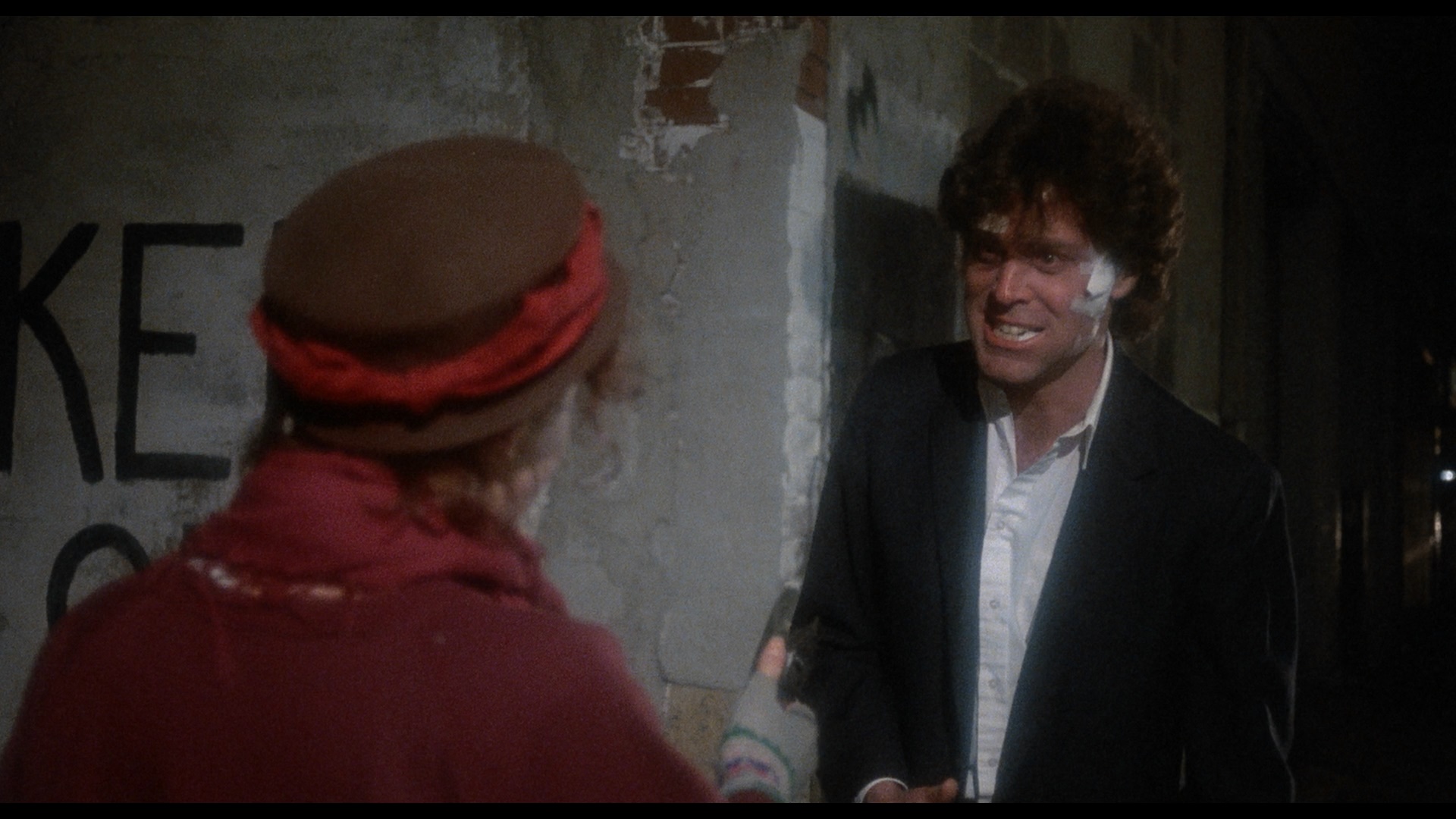 more information on both sides compared to both framing options on the MGM disc and looks nicely framed throughout, with more vertical information visible than the earlier 1.85:1 option as well. (See below for a few comparisons.) The DTS-HD MA English 2.0 mono track also sounds good considering the very modest nature of the original source, which features some pretty sloppy sound editing at times. Optional English SDH subtitles are also provided. As for extras, in "A True Artist" (7m46s), Carlisle speaks over video conferencing (due to the current pandemic of course) about coming on this film just after his biggest cult hit thanks to an acting class, the extremely low budget, the way Cohen brought out a connection with her young costar that wasn't possible on the set, and her more ongoing pursuits as an artist. Then "A Shadow in the City" (9m13s) is essentially the full Cohen interview conducted for the documentary King Cohen in which the now deceased filmmaker discusses the making of this film as a simple project back in New York as a two-picture deal with Hemdale, including extensive location coverage that required him to memorably jump in front of the camera during a crowd scene that threatened to get out of control. A brief promotional gallery (38s) is also included; as with Vinegar Syndrome's other MGM releases, the trailer is absent here but can be found on the older DVD if you're a completist.