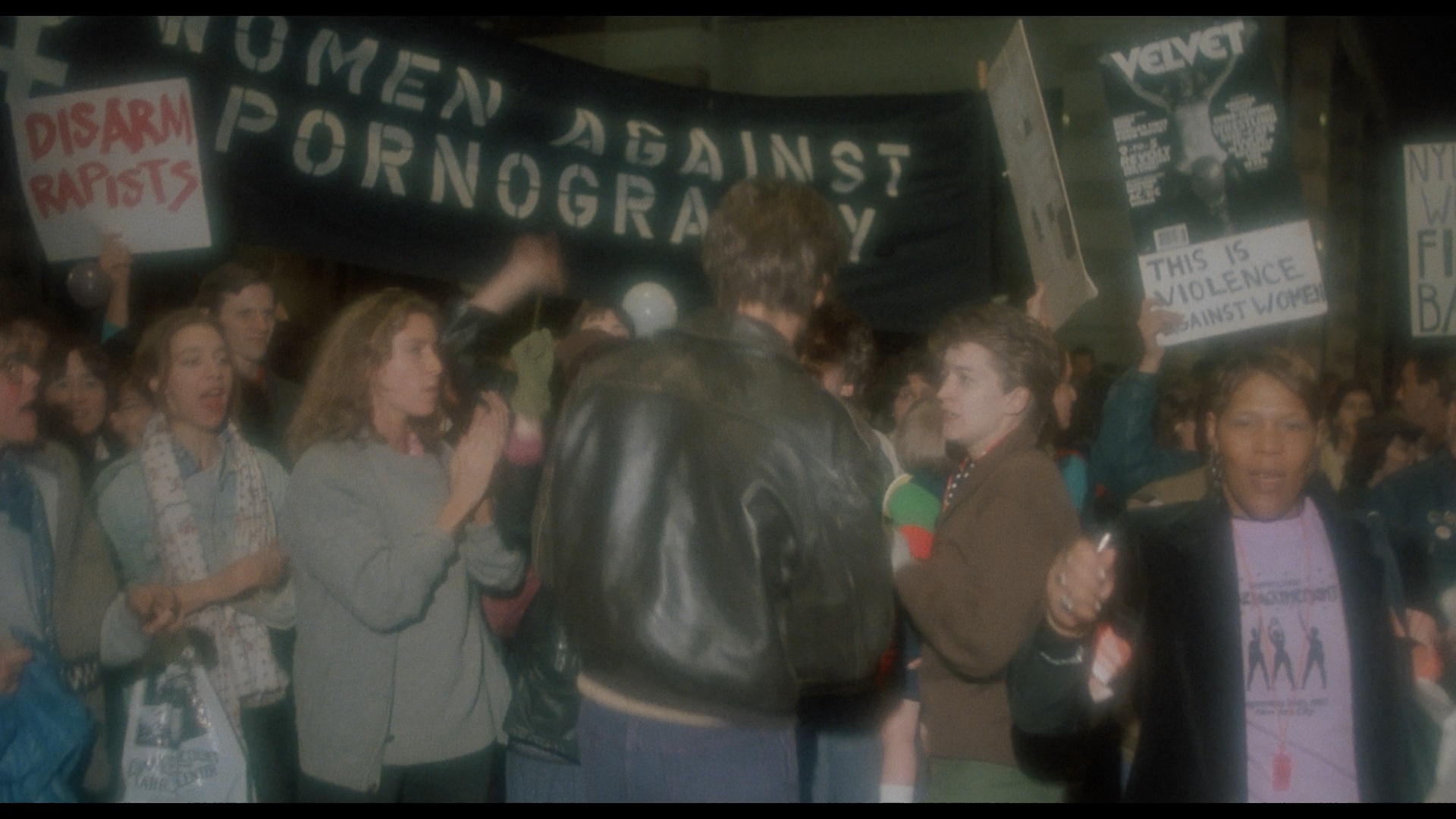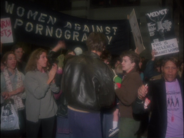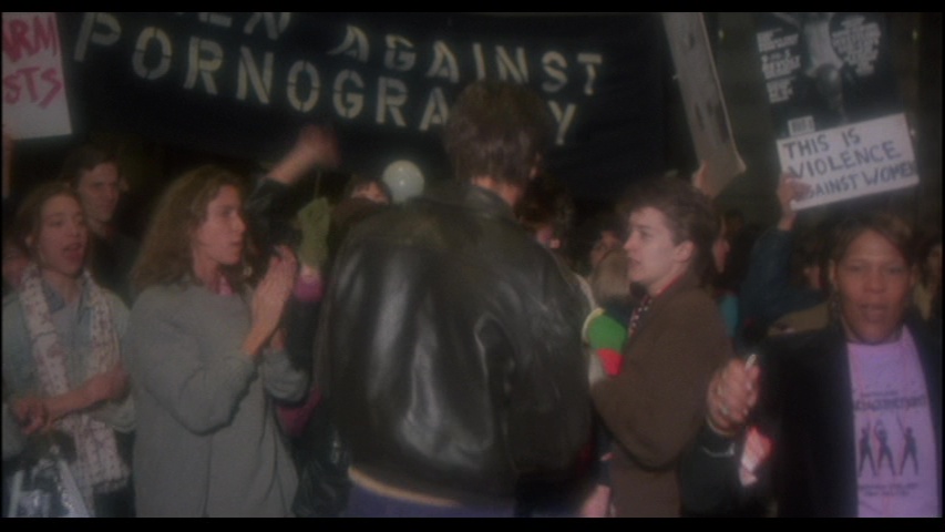 Reagan-era glory with Cohen indulging in his amusing habit of shooting guerrilla-style scenes in public (which he already famously pulled off during the spectacular parade sequence in God Told Me To). Here he does it multiple times including that abduction sequence and, most memorably, a great extended nighttime sequence at a Take Back the Night march peppered with anti-porn and LGBT crusaders as well.