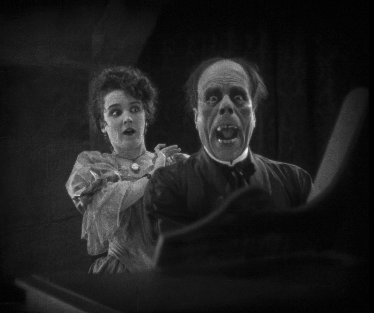 Two years later in 2013, the BFI released a dual-format version of their own containing three discs, and it's region free to boot. The Blu-ray is taken from the same excellent print used for the Milestone release but is thankfully free from all that digital smearing; it's now the really striking, lovely presentation it should have been all along and shows off the Photoplay restoration in its best light to date. (Frame grabs seen here are from this version, which should also give you an idea of the color tinting.) The Carl Davis score also sounds tremendous courtesy of PCM stereo and DTS-HD 5.1 audio options, both of which sound great. (The 2.0 one is closer to what purists have heard in theatrical screenings, but either Supernaturalone works just fine.) Presumably because they were sourced from another print, the color scenes are noticeably windowboxed, as are a handful of additional shots. Notably, this is also the only release to date with the 1925 version in HD, taken from Photoplay's 16mm Show-at Home print. For what it's worth, this is the cleanest and most watchable transfer for this variant so far; it's still obviously from inferior film elements but a significant step up from the SD seen on other editions. (For the curious, click here, here and here for frame grabs from this version.) Both trailers are included as well ('25 and '29 sound reissue), but the most interesting inclusion is definitely the surviving fifth reel from the sound release (from the Library of Congress archives) complete with the chandelier sequence and some opera singing making for an effective, fascinating glimpse at how this tweaked talkie once played. Also included is the still perplexing opening sequence featuring a man with a lantern saying something to the audience in the sewers; likely prepared for a sound release at some point, this has often been tacked on to the beginning of the silent transfers and made for a very weird way to open the movie. The same package is carried over to the second disc, a DVD, while a third DVD contains the entire Lon Chaney: A Thousand Faces documentary from Turner Classic Movies, also seen in the TCM Chaney set. It's a great introduction to the pioneering actor with a look at his significant roles in many genres, and you'll probably want to move on to more of his titles after it's over. Finally the release rounds out with a wonderful essay by Photoplay's Kevin Brownlow (a silent film guru if there ever was one), an additional rundown on the film's release history from Photoplay's Patrick Stanbury, and a 1975 review by Geoff Brown. There's always room on any horror collector's shelf for another version of this eccentric, grotesque, and wildly endearing classic, and this one more than deserves a slot of its own.