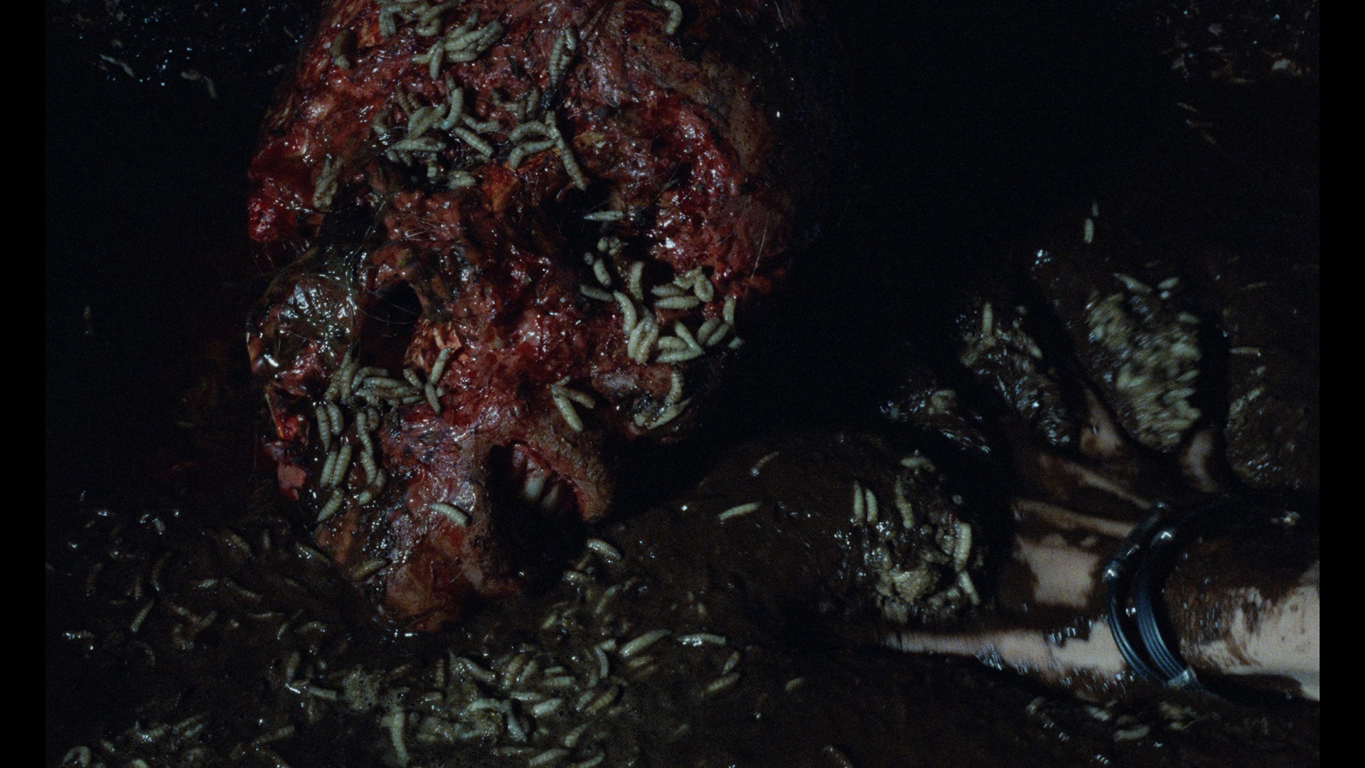 The following year, Arrow's UK branch threw another surprise into the mix with the announcement of a limited four-disc edition featuring a fresh 4K scan of the film from the original negative. The transfer features some additional image info compared to prior releases mainly on the top, which allows the landscape shots in particular to feel a bit more spacious and overwhelming than before. Almost every release of this film has had variations in its color timing, though this one diverges from past ones quite visibly with a more amber cast throughout. The bump in detail results in more of a discernible sense of depth (especially evident in that ambitious opening crane shot over the trees during the main titles). The Italian cut features DTS-HD MA 5.1 and PCM 2.0 options for both the Italian audio and a hybrid English-Italian track (a new crack at it with some different mixing variations compared to the Synapse one), with either optional English or English SDH subtitles. As usual the English track sounds more organic while the Italian one is more aggressive and features significant dialogue differences, including minor variations in some character names ("Greta" versus "Rita") and oddities like more overt references to necrophilia. The surround presence is pretty