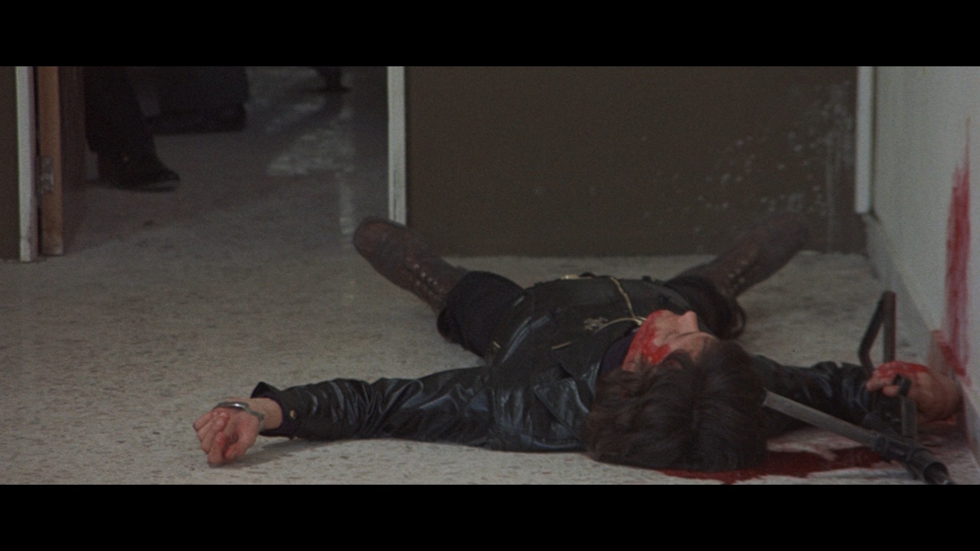 Of all the questionable DVD releases out there, the best one was probably the letterboxed 2005 one from Koch Media in Germany which appears to be the source used for a double feature DVD in the U.S. from Wild East in 2010 paired up with Summertime Killer. Clocking in fast at PAL speed at 101m14s, that disc was heavily interlaced and came with the U.S., international, and German trailers. If you were unlucky enough to watch the film in one of its numerous bargain bin collections like the 20-film Grindhouse Experience set from Fortune 5, you got a brutally cropped presentation that was also trimmed down and sped up to run 96m40s from the old VHS master. That one was jammed on a double-sided DVD with Executioner 2, Poseidon Explosion, and Earthquake 7.9, which makes perfect sense. At least anything ripped from the old U.S. tape featured the English-language insert shots (see the second comparison example below) which have otherwise been missing since. The first really excellent presentation of the film finally arrived in 2019 on Blu-ray and DVD in Germany from FilmArt featuring Italian or English audio with optional German subtitles, plus the 95m49s German cut of the film in lesser quality, a 4m16s Confessions of a Police CaptainNero interview (in English with German subs), the German trailer, a 5m7s gallery, and, uh, bonus kung fu and giallo trailers.