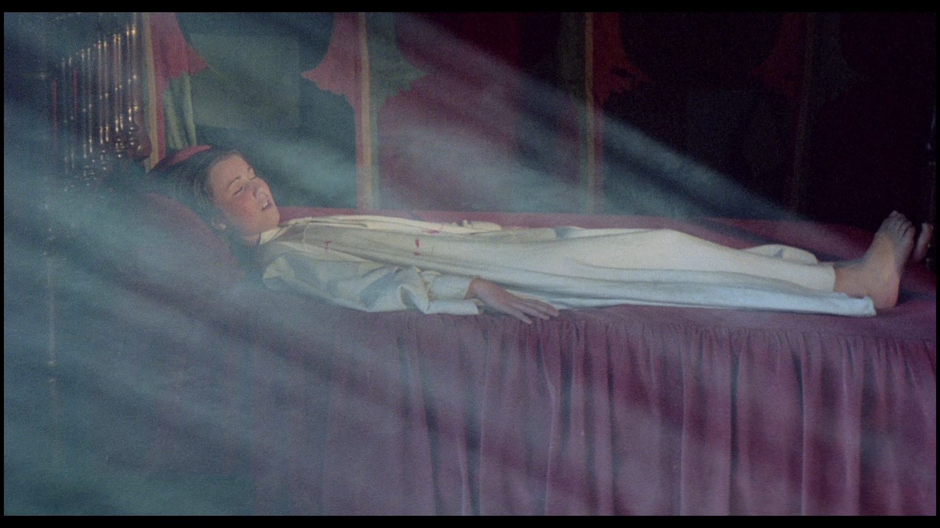 in German 5.1 DTS-HD and 2.0 Dolby Digital, English DTS-HD 5.1, Italian and Spanish 2.0 Dolby Digital mono, with optional English or Japanese subtitles. Extras include a 36-image gallery, trailers (this film, Love Camp, Doriana Gray, Voodoo Passion, Women in Cellblock 9, Greta the Mad Butcher, Swedish Nympho Slaves, Satanic Sisters, Wicked Women, Jack the Ripper, Downtown, and White Skin on Black Thighs), a Munich Film Museum appearance by Franco, Lina Romay, and Herbert Fux in 2001 (5m10s) with English or German subs, a "Memories of a Portuguese Nun" featurette (12m23s) with Dietrich, Franco, Fux, and Peter Baumgartner (with English, German, or French subs) chatting about Franco's directing technique and use of budgets with this film getting more resources than usual, and a 40m49s Franco audio interview from 1976 in German only. Image quality is excellent, taken from the original negative whose textless credits have been augmented with newly-created digital ones with those tell-tale glow effects.