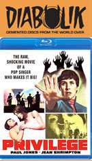 before Privilege finally appeared on home video after the studio struck a new print for retrospective screenings. In America the rights were licensed to Project X and distributed through the now-defunct New Yorker Films whose HD-sourced release looks excellent (albeit interlaced) and features some solid extras including "Lonely Boy," a half-hour 1962 documentary about Paul Anka that Watkins referred to heavily in the creation of his screenplay. Other extras include the theatrical trailer, a poster gallery, and a thick booklet containing a fascinating Watkins "self-interview" (shades of David Byrne) and two additional essays about the film.
