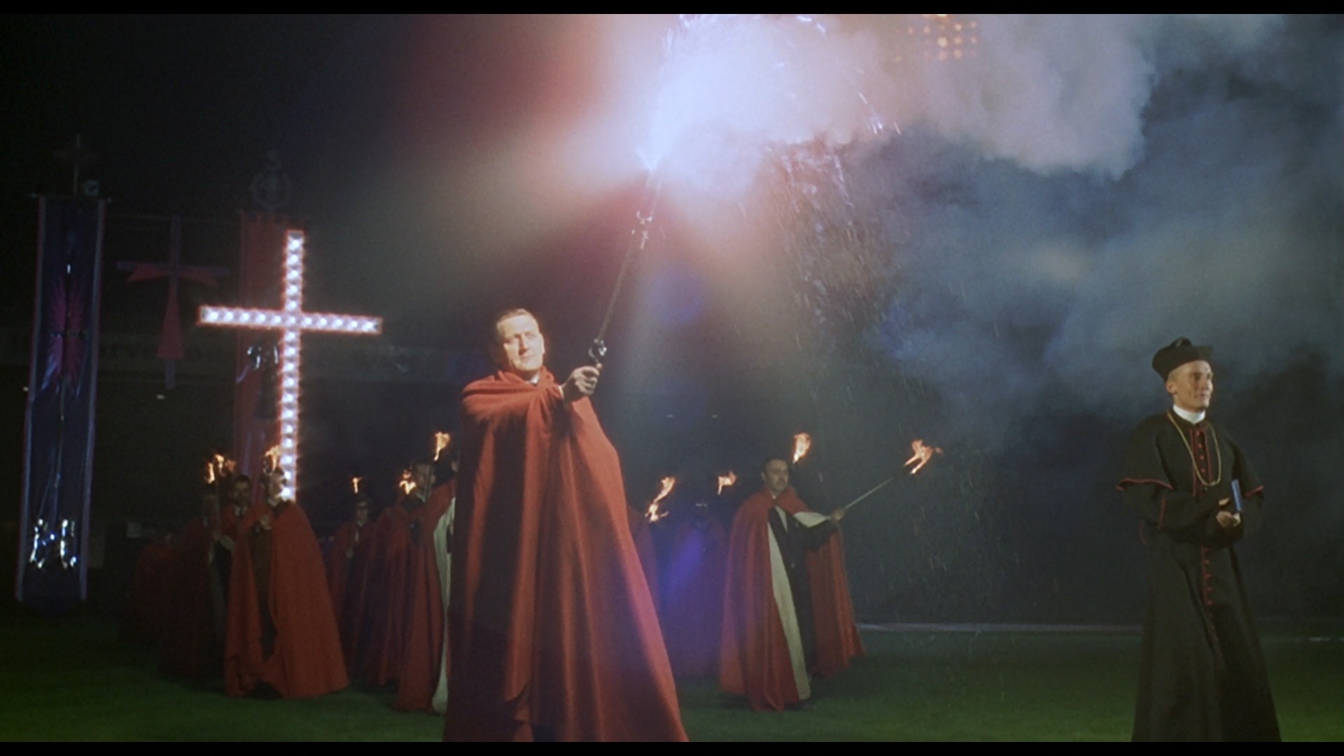 Watkins' Privilege was the first theatrical feature from the controversial director of The War Game, the infamous banned TV post-nuke "documentary." With this film, Watkins turned his eye to a story of Britain "in the near future" where a pop idol, Steven Shorter (Jones, former lead singer of Manfred Mann), holds a powerful sway over the population thanks to his elaborate stage shows which feature him hauled out of a burlap prisoner's sack and into a cell where stage police beat him savagely while he sings songs pleading for freedom. Naturally, the teenagers eat it all up, much to the delight of his hyper-efficient PR team which has managed to turn his persona into a massive commercial industry manipulated by both church and single-party state. The game starts to change when pretty painter Vanessa (real-life supermodel Shrimpton) is brought in to create his portrait only to fall in love with the battered, bruised, manufactured idol, whose misery mounts when his handlers make him the centerpiece of a nocturnal festival honoring a country-wide Christianity week meant to covert over all of his susceptible young fans.