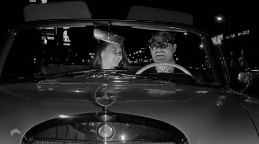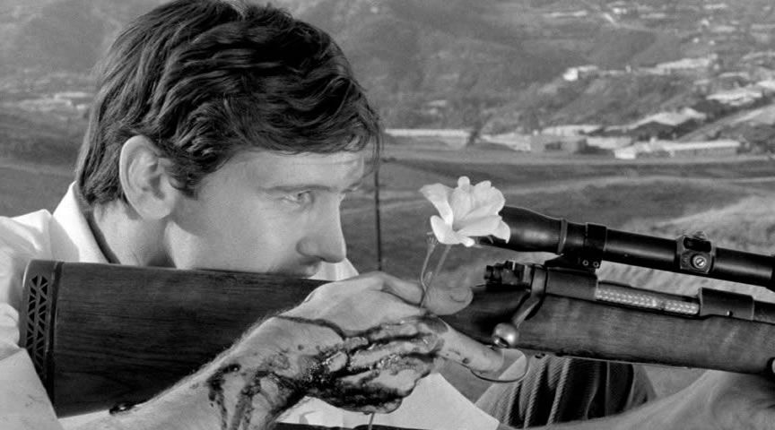 First on the packaging but second on the DVD is one of his more high-profile titles from the era, On Her Bed of Roses, which credits its source material (and alternate title) as Psychopathia Sexualis, the legendary 1886 psychological manual by Dr. Krafft-Ebing that introduced a host of kinks into the public consciousness. What we have here is essentially a modern case study sort of in line with one of the vintage case studies as young Stephen Long (Warren) is first seen getting sweaty and distraught in a rose garden. Afterwards he hops into his car with a guitar case containing a haunting rifle, drives out to the dusty outskirts of town, and starts firing at passing cars in the middle of the