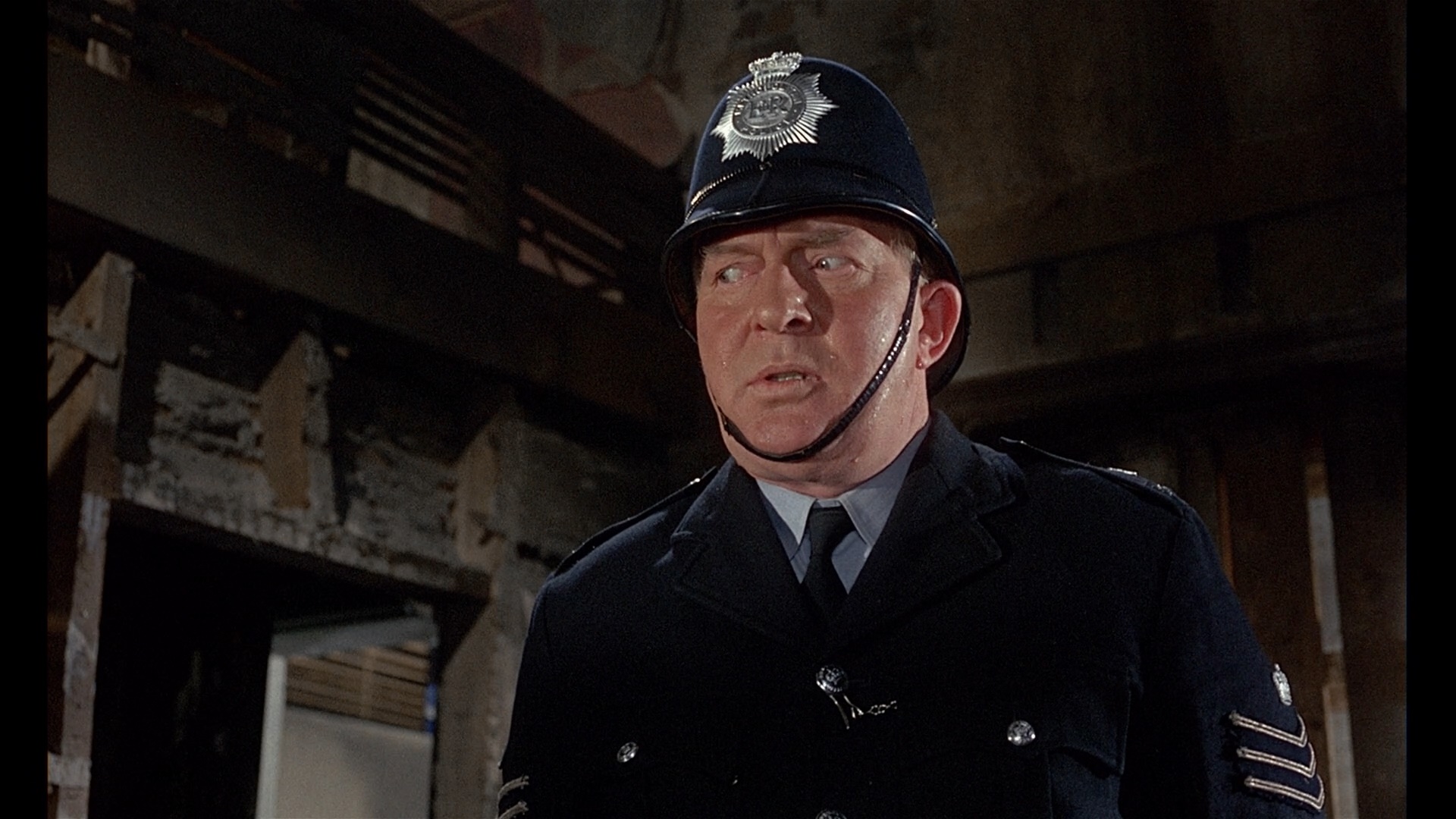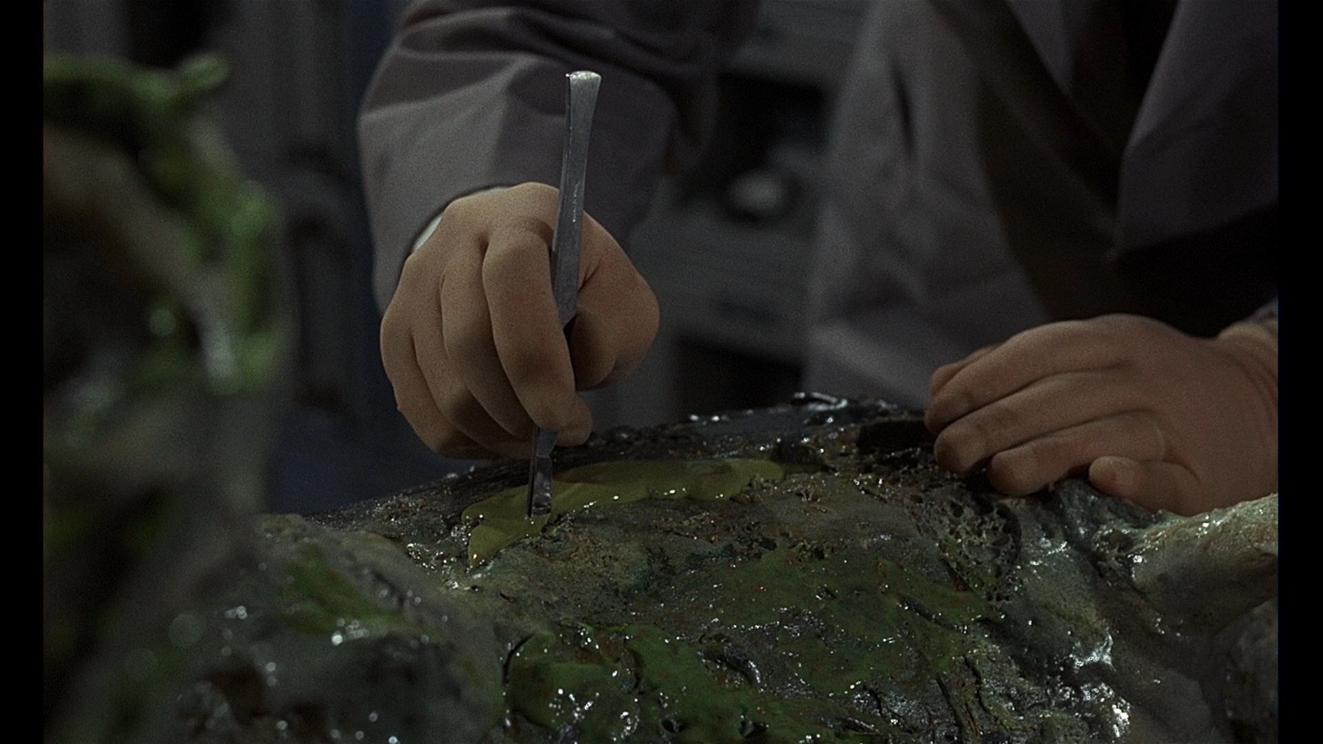with Constantine Nasr and Steve Haberman (a return to Hammer after their great earlier track on Frankenstein Created Woman). Both tracks are very informative and frequently filled with amusing observations with surprisingly little overlap; both compare and contrast this with the TV version and note the film's complex treatment of the relationship between science and the military (mostly represented by Julian Glover's interesting performance), but you'll also hear about an earlier aborted attempt to make this at Columbia (as The Pit), Baker's open infatuation with Shelley, Kneale's dissatisfaction with the two earlier Quatermass films, the state of Hammer at the time, and lots more. A new video interview with actor Hugh Futcher (6m40s) is quite funny as he talks about the infamous fainting incident that got him hired for the film and his shared agent with Glover, after which special effects technician Brian Johnson (5m10s) briefly goes into the bits of "rubber and glue and jelly and stuff" along with butcher's material that were necessary to create practical illusions at the time. After that you get new interviews with clapper loader Trevor Coop (8m26s) and focus puller Bob Jordan (2m23s) recalling their early gigs on this film, the popularity of the original miniseries, the quality level of the special effects for the time, and the ways they got into the industry. In addition to all the featurettes from the U.K. disc, both the U.S. and U.K. trailers are included (the U.S. one in far better quality) along with 1m25s of TV spots, the U.S. title sequence, and a gallery (5m29s) of stills and promotional material. All told, this is still bracing, scary, thought-provoking stuff with enough subversive ideas to fuel a dozen other genre films.