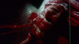 Four years later, Code Red revisited the title for a Blu-ray edition (dropping the trailer, which is no major loss) that turns out to be a little more puzzling than expected. The general appearance is similar and it's thankfully now progressive, but the framing has been slightly adjusted to 1.78:1 compared to the DVD's 1.66:1. The adjustment means a bit less information at the top and more on the bottom, with a bit extra on the sides varying from one scene to the next. The color timing also shifts significantly on two of the reels; the first now leans more to the pinkish side, while the third is darker and looks more blue compared to the DVD. For example, here's a shot from the first reel on the DVD compared to the same image from the Blu-ray seen to the left, complete with different damage marks. It's a mystery, but given the mystique already surrounding the film, perhaps that's as it should be. In any case, having The Redeemer in HD is something of an outrageous miracle in and of itself, so prepare for the glory of '70s scratchy drive-in authenticity implausibly preserved in 1080p for generations to enjoy.