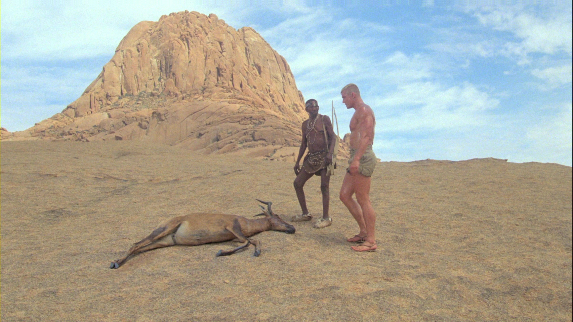 Not many movies would dare to put anti-Communist rhetoric and African racial conflict in the same story, but this one does its best with the story of KGB agent Nikolai Rachenko (Lundgren, natch), sent to Africa to take out the "dangerous" head of an anti-commie rebellion. He and his comrades arrange a stint in jail to make him look like a deserter, where he winds up with a motley crew of characters including a sweaty American reporter (Walsh) and a freedom fighter (White). However, a few nasty twists of fate leave him stranded out in the desert, where he gets a big wake-up call to the evils of communism and, after communing with a local bushman, learns how to use his formidable shooting skills to fight for justice.