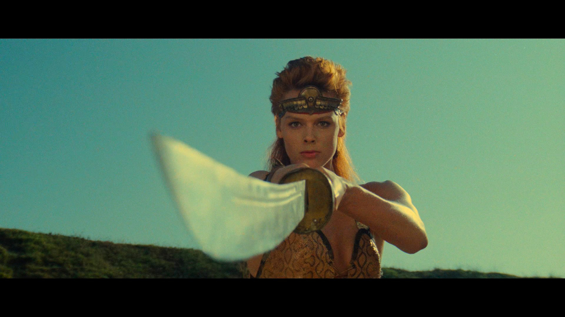 1982 and particularly gained traction in Italy was already slowing down considerably three years later with films like Ladyhawke, Legend, and The Black Cauldron proving to be less than blockbuster hits (though all have big cult followings now). To that list you can add Red Sonja, an attempt by producer Dino De Laurentiis to continue the cycle he had begun with Conan the Barbarian and its lighter, more family-friendly sequel, 1984's Conan the Destroyer from director Richard Fleischer. De Laurentiis managed to wrangle back star Arnold Schwarzenegger again for a character called Lord Kaligor here but otherwise the same as Conan in pretty much every way, with his name changed due to rights issues. The title character in Red Sonja is credited here to Conan writer Robert E. Howard and his Red Sonja of Rogatino, though it's far more closely based on the chain-mail bikini-wearing Marvel Comics character (using the current spelling and initially a spin-off from Marvel's Conan comics) whose publishing run initiated by creators Roy Thomas and Barry Windsor-Smith ended a year after this film.