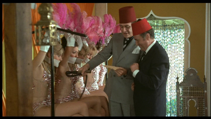 "Somewhere in England," the lovely and wealthy Utta Armitage (The Legend of the Seven Golden Vampires' Ege) is giving a press interview about some recent circumstances that have put her in the limelight along with her industrialist husband, Jeffrey (UK TV vet Sinden). Mr. Armitage has two problems: he thinks his wife's cheating on him, and several suspicious international powers are keen to get their hands on a new nerve gas he's cooked up that causes temporarily paralysis. "Famous secret agent" Madam Greenfly (You Only Live Twice's Chin) has a squad of craft Japanese spies working on prying the formula away, not to mention some Arabs who are into enslaving scantily-clad British showgirls. To solve both challenges, it's up to the detectives at Upton Security, whose head, Major Upton (The Bed Sitting Room's Fraser), sends the girl-shy Hobbs (Beckinsale) to, uh, get to the bottom of Mrs. Armitage, while the easily corrupted Hamilton (Booth) and Miles (Briers) wind up taking bribes from Greenfly on their way to protecting the nerve gas. Given the title and basic subject matter, you'd expect this to be a T&A-packed snickering sex comedy about randy young lad detectives getting into all sorts of naughty trouble. Well, there are plenty of innuendos, but this is actually less raunchy than your average Benny Hill TV episode. Ege shows off her Thanks to the strength of its cast and reasonable nostalgia value, Rentadick has stayed in circulation on video regularly in the UK (including a 2007 DVD from Network) but remains almost completely unknown in America. The 2013 Scorpion release will be a first time experience for many viewers, who should get a kick out of its broad slapstick comedy and the ridiculous barrage of non-PC treatment of minorities, who are so exaggerated here one has to wonder whether anyone was offended back in '72. The picture quality looks quite strong throughout, with lots of appropriately garish colors and workable compositions framed at about 1.78:1 with slight windowboxing on the top, bottom, and left sides. (Presumably this was an anamorphic transfer originally created by Rank.) You don't really get any extras directly related to the film, but it is presented as part of the label's "Kat Skratch Action Cinema" line with hostess Katarina Leigh Waters pulling double duty here both as herself, firing off the usual rounds of trivia about the cast and crew, and her deranged French twin sister, who hijacks the wraparounds while dressed up in Sherlock Holmes drag. Stay tuned after the film for a particularly bizarre (and funny) payoff for fans of her other "Nightmare Theater" line, too. Also included are additional trailers for other Scorpion titles like Quest for Love, Kill and Kill Again, Tomboy, The Pom Pom Girls, Joysticks, Alley Cat, Voyager, and The Internecine Project.
