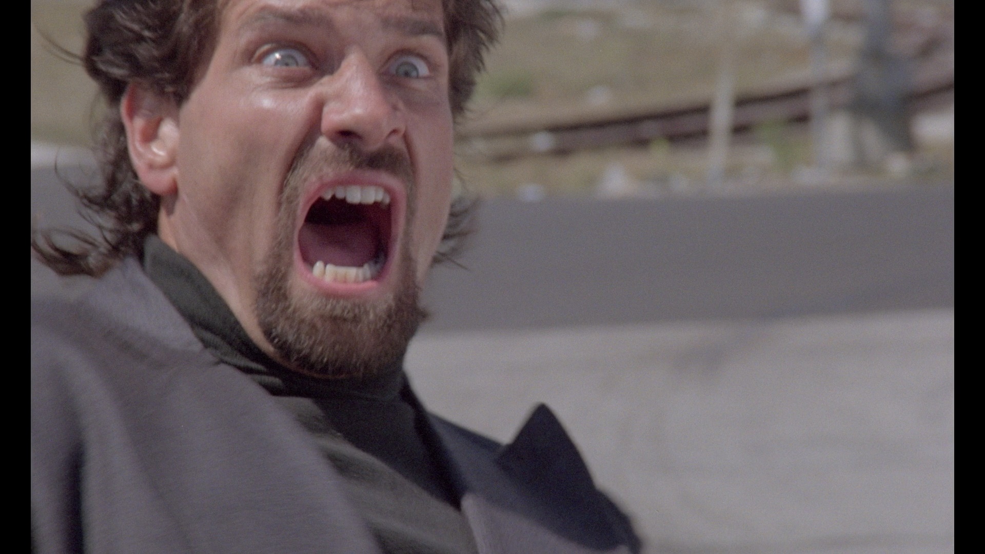 2020, new label Cauldron brought the film back to the U.S. for the first time in decades as one of its inaugural Blu-ray releases along with Abrakadabra complete with slick slip sleeve packaging and a new 2K scan from the original camera negative. The image quality does indeed differ significantly, revealing that some extensive noise reduction was applied to the earlier release; quite a bit of additional detail is visible here with textures on clothing, hair, and interior decor looking far more convincing with less of a waxy appearance. It's also brighter and features some framing variations throughout, mostly shifting down and to the right slightly for most of the running time. (Compositionally it looks workable either way; frame grabs in the body of this review are from the Cauldron with comparisons below.) Color timing also varies, with a less earthy look and a handful of exterior scenes (such as the fourth shot at the bottom) looking cooler and more overcast. In motion it looks great and makes for a significant upgrade, not least of all for finally running at the correct film speed. The LPCM English mono track also sounds great and sports English SDH subtitles. A new audio commentary by Kat Ellinger and Sam Deighan centers almost completely on Martino as they chat about his flexibility with different genres, his tendency to veer away from established formulas, the impact of Claudio Cassinelli's death on Hands of Steel, the depiction of Asian characters at the time, the connections to other directors throughout Martino's career, the director's lack of a consistent visual signature, and the relentless insanity of the entire story. The interview featurette with Martino and Geleng is also included here, but you also get a new location "Then and Now" featurette (2m52s) showing various locations around the city in their 1989 and 2019 states. An episode of The Projection Booth podcast (65m30s) is quite amusing as the gang attempst to grapple with the sheer craziness of the fim and form an appreciation society for what should be a major cult fim in the making. Finally the disc closes out with an image gallery (1m4s) featuring a wealth of international artwork from the film's theatrical and home video releases along with a smattering of promotional stills.