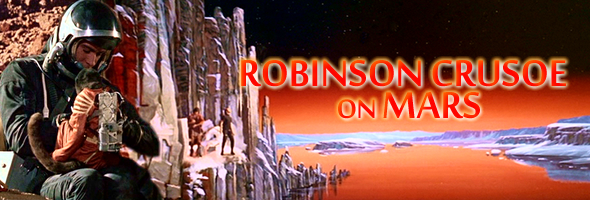 The "Boy's Adventure" story formula has been around as long as writing, leading to a string of immortal characters like Tarzan and Superman who get to live by their own rules in an environment that becomes their own playground. Another of these, Daniel Defoe's literary stalwart Robinson Crusoe, took this to an extreme by starting afresh on a remote island with only a native named Friday as his companion. When the Atomic Age kicked in during the '50s and launched a sci-fi craze that still lingers today, it seemed only a matter of time before someone decided to fuse the Robinson Crusoe idea with the interstellar gimmickry that was pervading everything from movies to TV to popular music. Of course, the concept is spelled out right in the title of Robinson Crusoe on Mars, which turns our shipwrecked hero into Commander Kit Draper (Mantee), an astronaut who crashes onto Mars and loses his co-pilot (a pre-Batman West) in the process. With only a test monkey named Mona as his companion, he must learn his survival skills from scratch in this colorful but forbidding environment. Ultimately his own Man Friday (Lundin) comes along, but with other alien presences to contend with, he may not last much longer.
