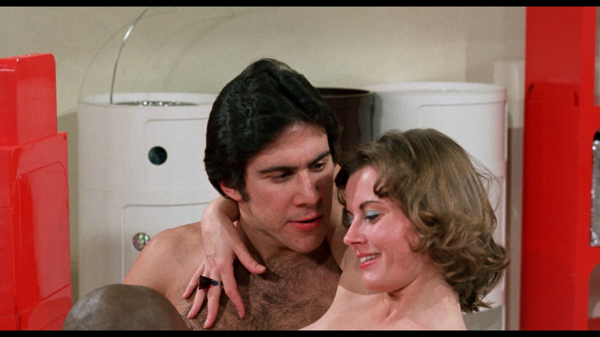 of naked roller skaters in a variety of surprising positions, most of which are more suspenseful than erotic. The rest of the cast is packed with interesting actors from the period including the always busy and athletic Terri Hall, newcomer Suzanne McBain's first role (which Stevens claims she was really, really into), charming goofball Mary Stuart, and semi-crossover actor Roger Caine (Martin). It's also a showcase for striking bald amazonian Yolanda Savalas (also a legit fashion model, according to the director, who went on to another, lesser smutty sci-fi, Invasion of the Love Drones). The whole thing is in good fun, and the cheap but creatively handled sets give the whole thing a lot more class and imagination than your average New York quickie.