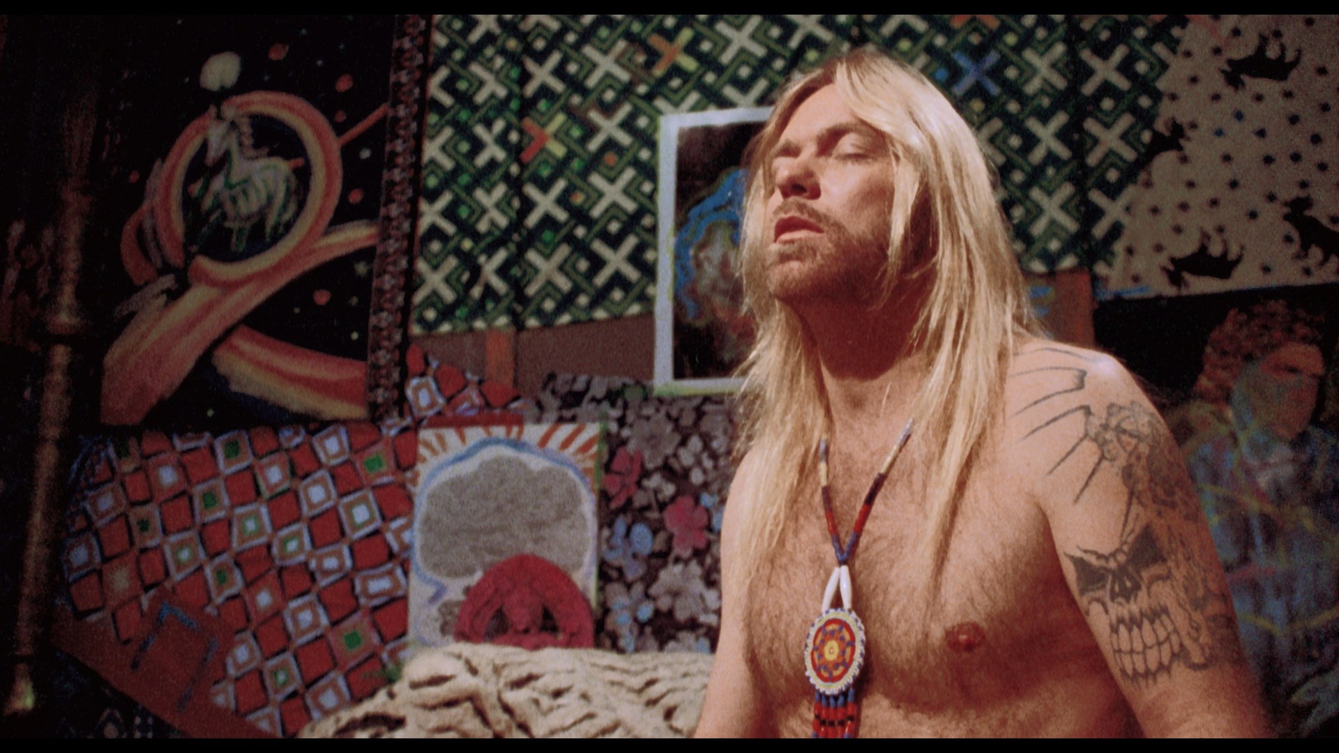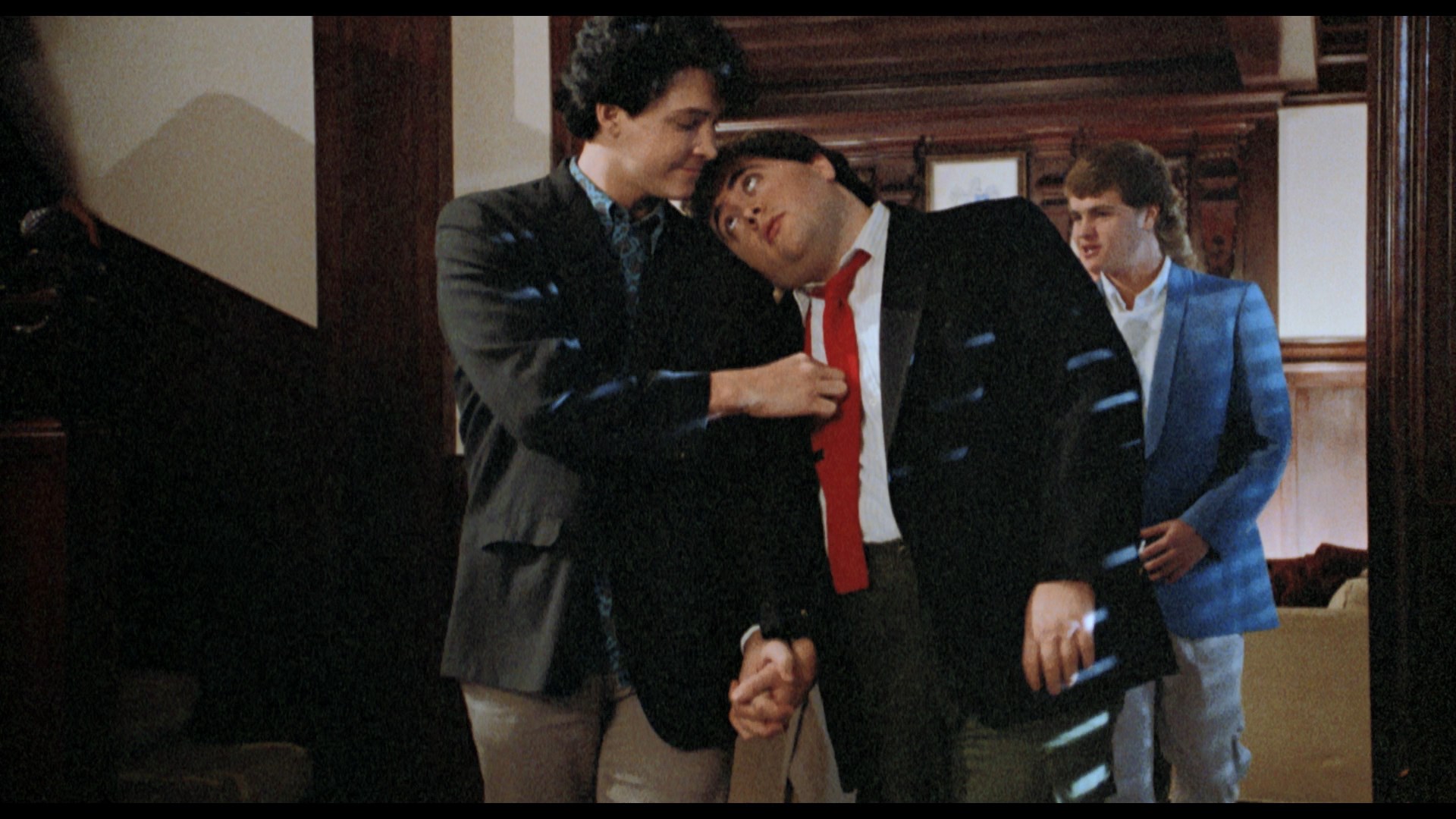 from a dated open matte video master that looked okay but unspectacular at the time with some slight image squeezing in evidence. In 20201, Vinegar Syndrome brought the film to Blu-ray (continuing its run of frat horrors after Pledge Night) featuring a new 2K scan and restoration from the 35mm interpositive (with the film somehow ending owned now by MGM under the umbrella of Orion). The Blu-ray looks significantly better with the scan bringing out detail and texture that was absent before, including natural film grain that retains the original gritty and sometimes rough appearance of the original film. Colors are bright and really pop at times, and any owners of the DVD should find this to be a significant upgrade. The restoration of the original matted compositions helps as well, bringing focus to a number of shots that seemed out of whack before. The DTS-HD MA 2.0 English track (with optional English SDH subtitles) sounds fine for the source, retaining the original Ultra Stereo mix which is essentially mono for the majority of the running time with some moderate channel separation turning up mainly during the music performances. The foursome from the long-running slasher movie podcast The Hysteria Continues! provide another fun audio commentary here chatting about campus slashers, late '80s horror, the comparative lack of gore, the sometimes puzzling home video release history, and much more. A new interview with actress Courtney Gebhart, "So 80's" (12m52s), is very upbeat and enthusiastic as she chats about her glee at getting to sing in the film, her early days as an actress, the process of shooting on 35mm on a low budget at the time, and her memories of her fellow actors as well as her director, veteran stunt man Bob Bralver. Then "Still Dean Hamilton" (12m58s) features the lead actor explaining how he came from Canada to L.A. and got started in soaps before plunging into this film, which was shot in a variety of locations around West Los Angeles (including a veterinary hospital) and allowed him and the rest of the cast to have a lot of fun during their party scenes.