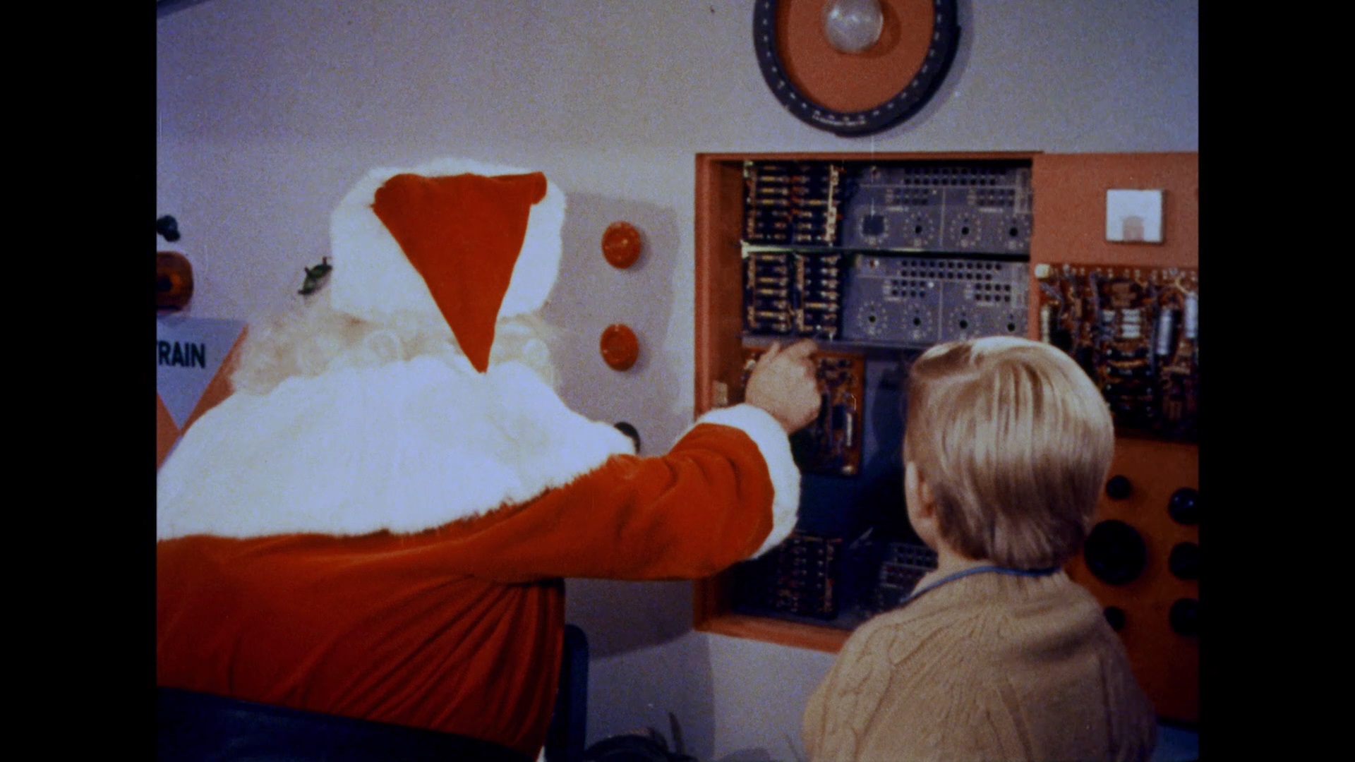 The first Blu-ray of this infamous stocking stuffer came along from Kino Lorber in 2013, with a bumpy initial pressing pulled after it turned out a master was used with 20 minutes missing. The corrected version didn't stay around for long and now goes for a hefty price, though the DVD option is still available. Extras include a newly created trailer, a stills gallery, and a "Santa's Cool Holiday Film Festival" (46m17s) reel of holiday-themed classic cartoons, commercials, and short subjects. In 2024, AGFA and Something Weird Video teamed up for a new Blu-ray edition released as Santa Claus Conquers the Martians and Other Holiday Hallucinations, this time presenting a "roadshow" version of the film from SWV's 16mm print. The film is preceded by six minutes of newly-scanned Christmas theatrical bumpers including a great 1971 one and a K. Gordon Murray compilation feature, Santa's Giant Film Festival of the Brothers Grimm. The main feature is also interrupted by an amusing intermission featuring a certain retired Oscar winner doing a Christmas Seals pitch. Transfer-wise it's quite different from the Kino Lorber in terms of color timing, as you can see from the comparison below; this