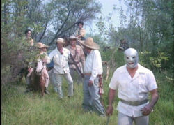 Now here's a real oddity: a Mexican remake of Death Curse of Tartu! Well, close enough, anyway; in this Santo outing, the formidable wrestler dons a safari hat and joins a jungle expedition into the ruins of the Opalche Indians. The colorful group of explorers includes blustery Professor Jiménez (Ancira), macho Sergio (Eric de Castillo), and an insufferably cute kid, Agapito (Jorge Guzman).