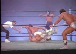 help them rise to the surface. Cut to a remote country road, where young Diego watches in shock as his parents are beamed aboard a spaceship while fixing their truck. Meanwhile Santo, Jr. is busy in the ring with his pal Blue Panther, who seems unusually aggressive during the match. Afterwards Santo watches the bout again on video and determines that his friend was actually trying to kill him and may not be himself. Sure enough, Santo and Diego cross paths in a parking garage where the possessed Blue Panther, an alien and a bunch of mind-controlled henchmen show their true colors. Barely escaping in his flying car, Santo must discover a way to stop these nefarious creatures from taking over Mexico before the sort-of-special effects-filled climax.