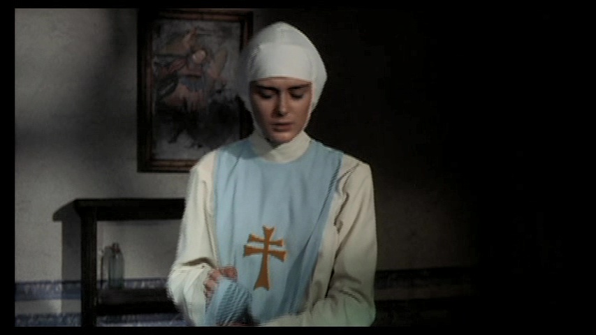 blasphemous Italians a run for their money. (And yes, its title was later used as the name of Selma Hayak's character in From Dusk Till Dawn). Directed by Mexi-horror veteran Gilberto Martínez Solares, who also helmed a few wrestling monster pictures as well as the better chunks of Face of the Screaming Werewolf, our story revolves around sweet young Sister Maria (Pezet), a tranquil and benevolent nun who spends her afternoons wandering through the woods, picking flowers and admiring the birds. Unfortunately her life changes when she's confronted by a swarthy naked guy (Rocha) prone to gnawing on apples. Back at the convent, she finds her prayers insufficient to block the evil influence now creeping into her soul; she even retires to her chambers at night where she indulges in violent fantasies and whips herself into a sexual frenzy. The strange man keeps reappearing (once in the form of a lesbian nun who ravishes her on the floor!), and she realizes he may actually be Satan himself, intent on making her an instrument of evil. Soon enough she's causing all kinds of trouble, making moves on young village boys, provoking suicides, and spilling innocent blood in a rampage of demonic lust.