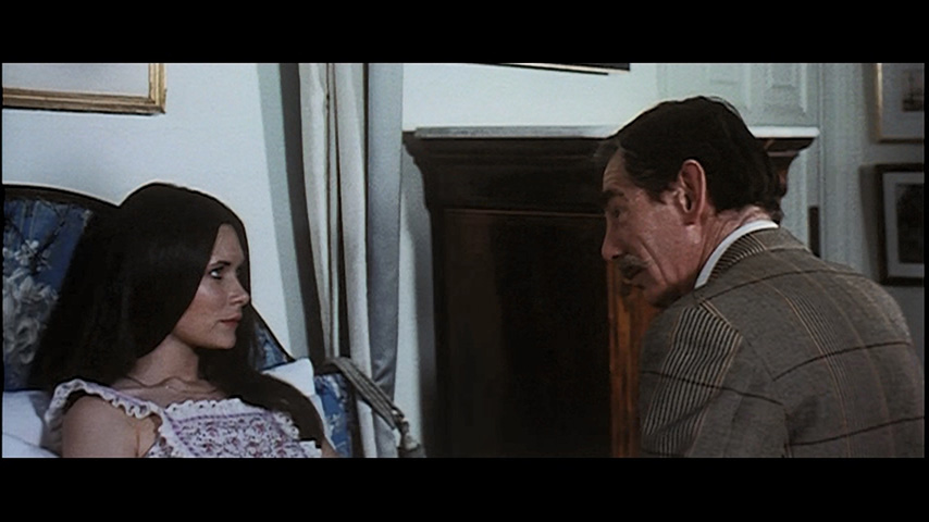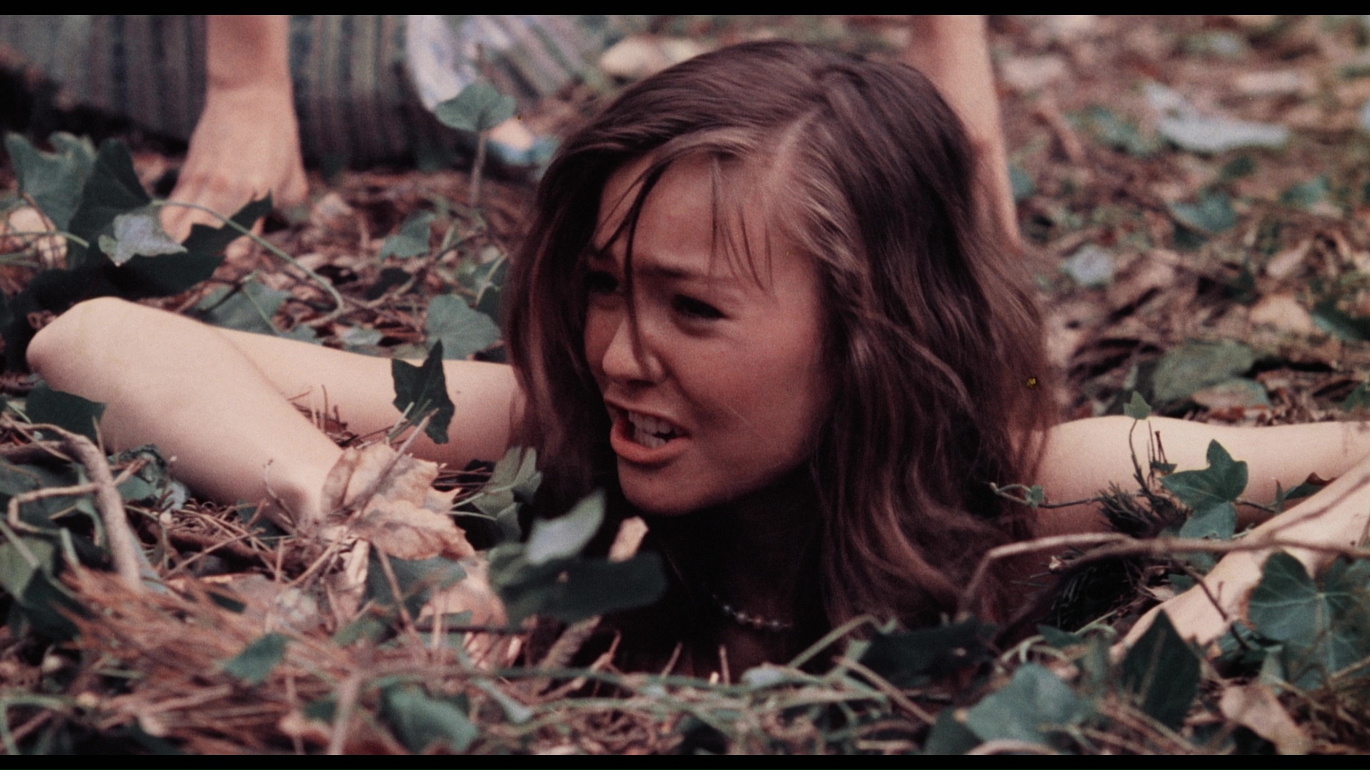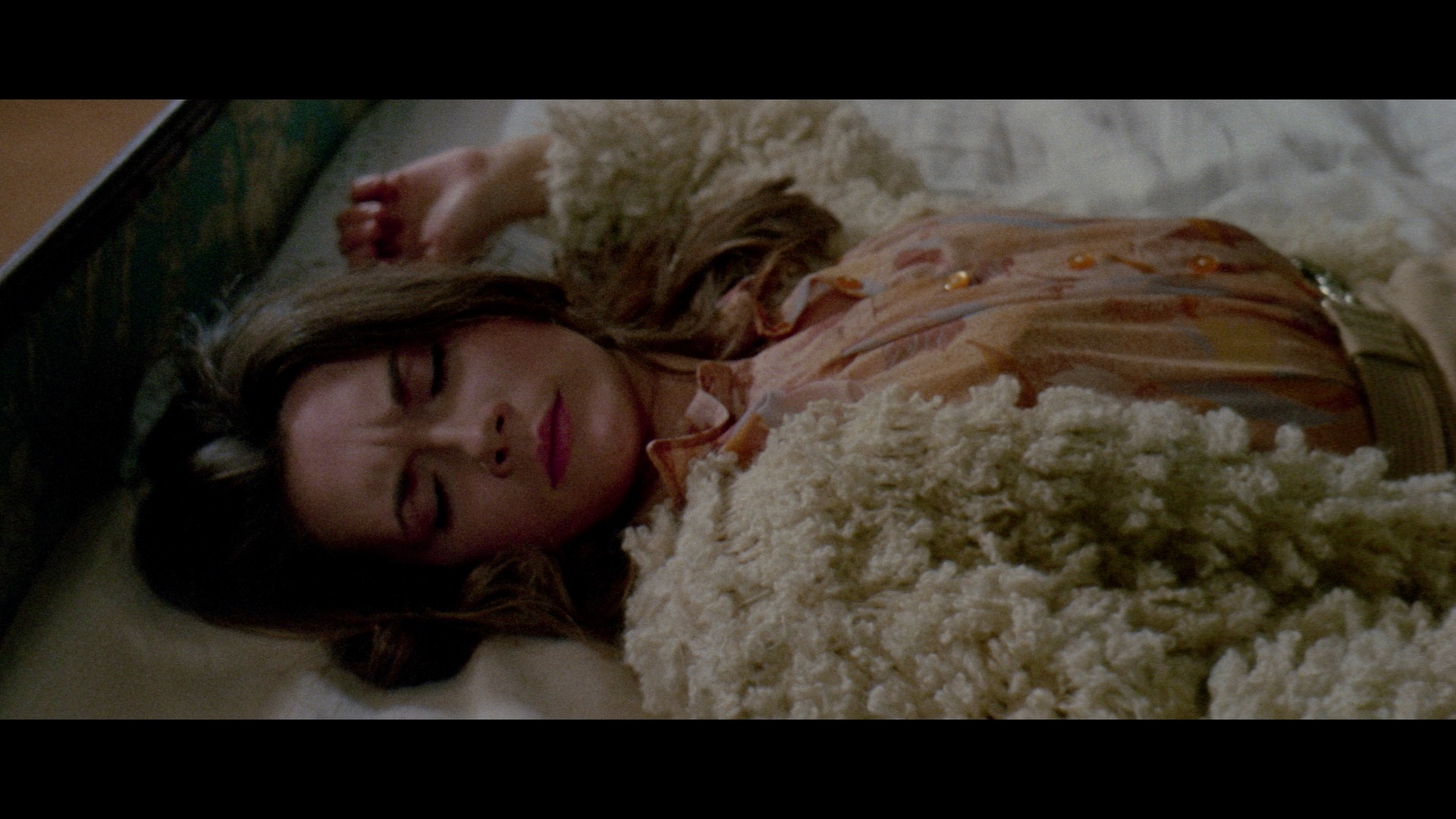 Next came the 2012 edition from Scorpion Releasing, which automatically bested its predecessors simply for being the first full-strength version ever released in the original aspect ratio anywhere in the world. The transfer looks pretty close to the Anchor Bay one, i.e., correctly framed, clean film source, and reasonable color timing that's a bit darker here; it's definitely light years ahead of the previous BCI one by a long shot. All of the footage from various versions around the world appears to be intact here, and it even features an absolutely awesome vintage Brent Walker opening logo that has to be seen to be believed. Apart from dropping the audio commentary, the U.K. video extras have been carried over here and then some. "All You Need Is Blood" (13m14s), a featurette created during filming, is a fun promo piece about the making of the film, including behind-the-scenes footage of ritual sequences, Gough hanging out in the woods, creation of the copious fake blood, and staging that crazy suicide scene. "Devilish Music" (12m34s) features Scott at a piano talking about the "strange music we could probably never do again" for the film and even doing a demo on the keyboard. "Creating Satan" (29m51s) is the beefiest of the bunch, with Warren, McGillivray, Potter, producer Les Young, production designer Hayden Pearce, associate producer Moira Satan's SlaveYoung, and distributor salesman Ken Dowling talking about getting Gough for the film, finding girls able to do the demanding ritual scenes, following this film hot on the heels from the same distributor as Thriller: A Cruel Picture, and Satan's Slavehow it was paired up in theaters with Curtis Harrington's Ruby. You also get three minutes of B&W deleted scenes from the workprint (two scenes, both inessential - a tea party and an alternate dream sequence), with no audio but filled in with some commentary and music tracks. The disc is rounded out with the earlier B&W Warren short film "Fragment" (10m4s), a loose and jazzy little piece previously available on the BFI release of Her Private Hell, along with the theatrical trailer and bonus trailers for Terror and Death Ship. The film is packaged as part of Katarina's Nightmare Theater, with hostess Katarina Leigh Waters proferring plenty of facts about the film against grisly backdrops of scene highlights. As usual these wraparounds are optional when you choose to play the film, but given the trivia value and amusing nature of the sexy satanic setting, there's no rational reason to pass them up.