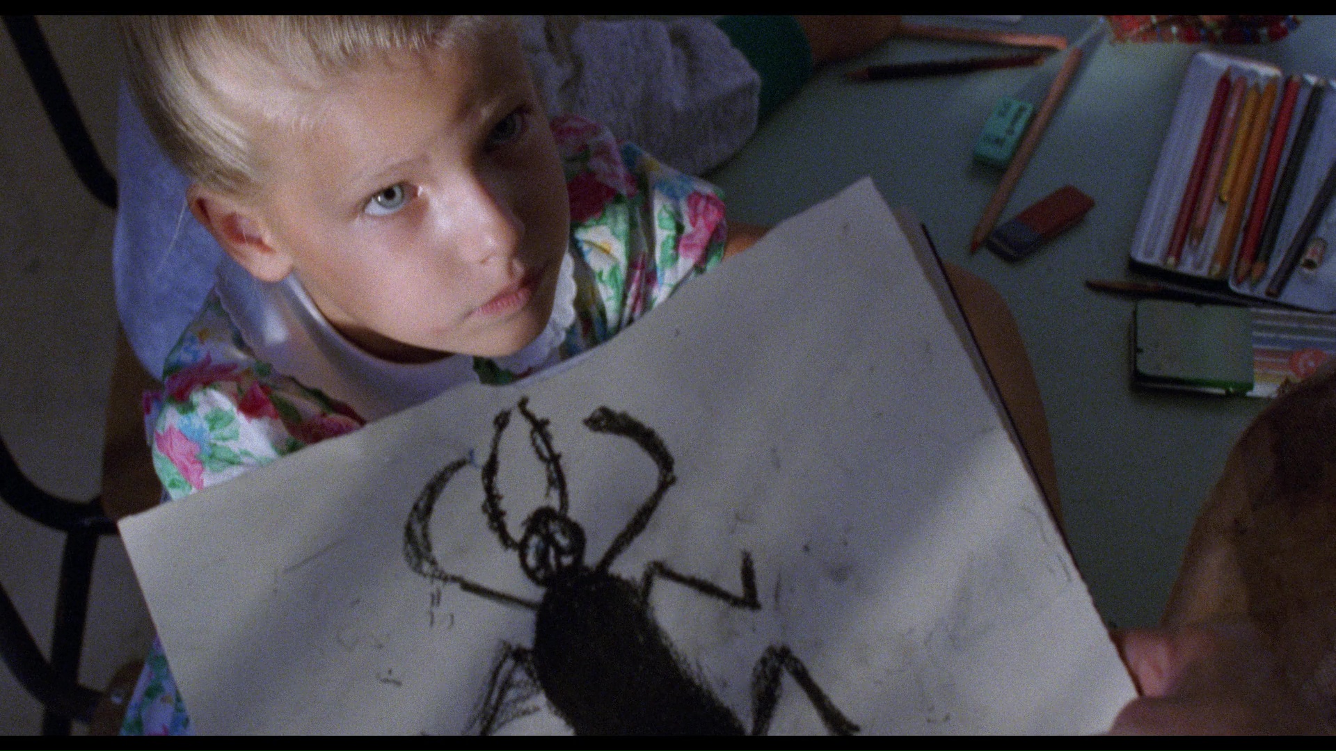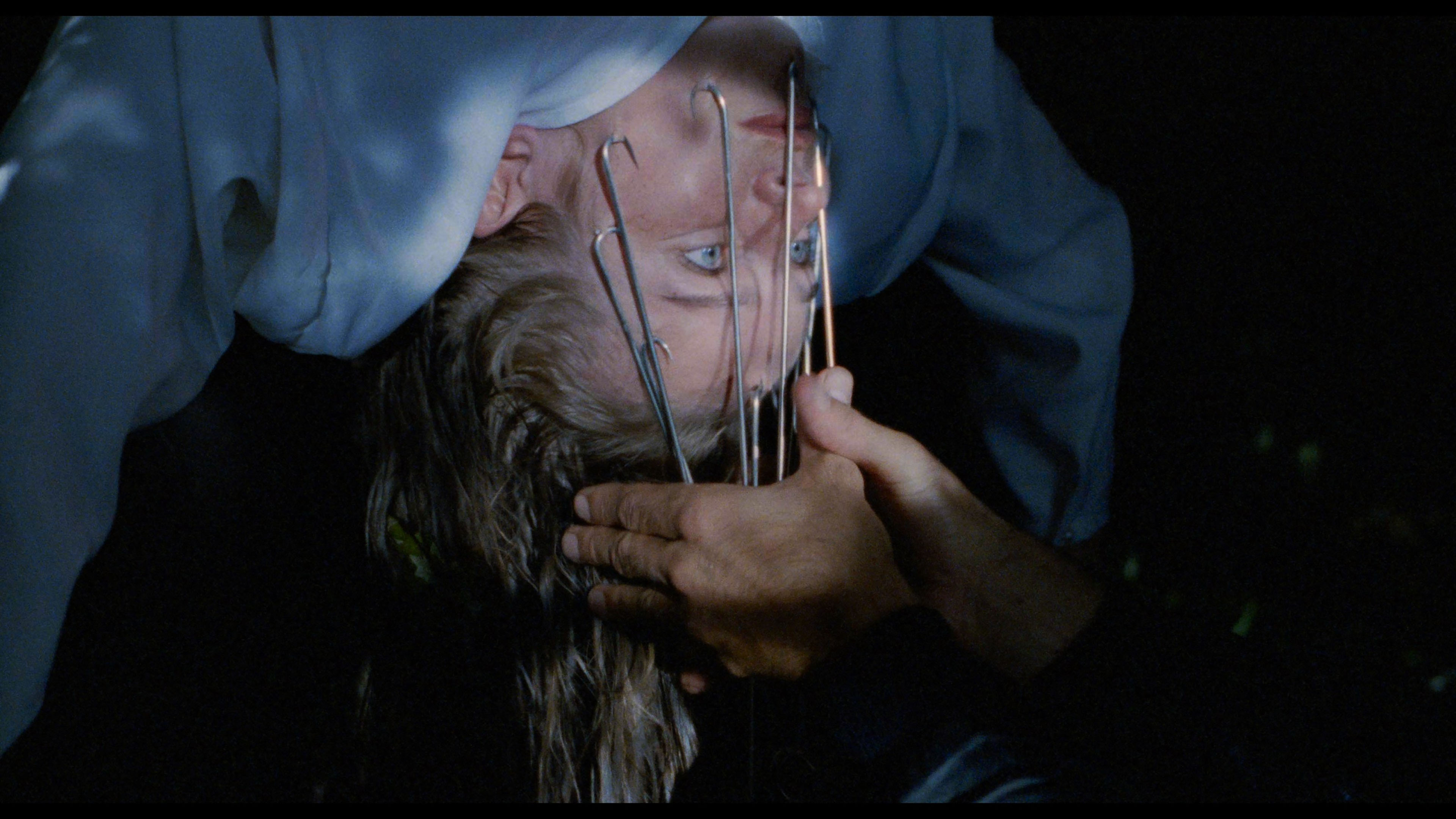 A U.K. Blu-ray release from Shameless came around in 2017, with a simultaneous DVD edition sporting completely different cover art. The transfer features a new 2K scan from the original negative, featuring the English-language The Sectopening and closing titles (including that wince-worthy "and whit" at the end). The film is easily the most visually peculiar of the Soavi cycle with a soft, hazy, vaguely druggy sheen to it that's proven very challenging to transfer to the small screen before. This one looks better than the earlier DVD with that troublesome orange toned way down, and with visible image info visible on the sides as well. However, blacks are very flat and gray, taking quite a bit of punch out of the imagery, and detail is often quite soft (with some horizontal squashing evident). Contrary to the "PAL" designation on the back of the sleeve, the film is presented at its correct original film speed. The feature was intended to be released in English with Curtis and Lom providing their own voices (and everyone else dubbed, though the actors spoke English on the set), but that mix is one of the weakest of its generation with a flat soundtrack seriously dampening the music and causing the dialogue to sound utterly bland and disaffected. That English track is here as an LPCM mono option, but the big plus here is the DTS-HD MA Italian "5.1" track (with optional yellow English subtitles). It's actually still mono but vastly superior track in every possible way; the dialogue is more dynamic and beautifully recorded, sound effects are crisp and effective, and the music now has much more presence and range. It really gives the film some much-needed punch and makes for a far more enjoyable viewing option. The main new extra here is "Beauty and Terror," a 29-minute interview with Soavi from the same session as his interview featured on The Church. He starts off chatting about working with Lucio Fulci and Joe D'Amato before shifting to a look at how this film came about, including anecdotes about the inspiration of catacombs at his own house and the process of casting Kelly Curtis. His story about wrangling that giant demon bird is fun, too, and he reveals which images and story points were contributed by Argento. Also included are bonus promos for The Church, Dellamorte Dellamore, and Four Flies on Grey Velvet.
