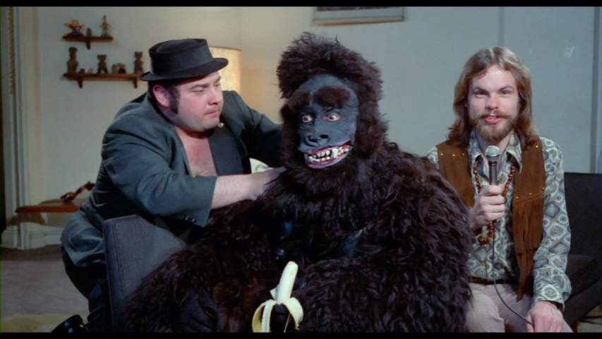 (and first seen riding a newspaper at a bus stop), but the main concern for Montclair is capturing the ideal zodiac sex positions for all the Tauruses, Pisces, and Leos out there, all explained in hilarious detail by our humble narrator. Monica winds up taking a new nymphet (O'Neal) under her wing (in every sense) who threatens to unseat her role in Montclair's big feature film, but the dramatic tension takes a backseat to the multitude of oddball sex scenes, zodiac lessons, and surreal comedy. Apparently conceived as a softcore comedy and spiced up with additional (fairly brief) hardcore moments featuring then-spouses Tina and Jason Russell, The Sexualist is an absolutely bizarre film that couldn't have possibly proved satisfying to the raincoat crowd. However, if you're looking for a zany cult film in sexploitation drag, this one more than delivers. Nary a minute goes by without a daffy comment from the narrator or a nutty sex act that defies belief (with the gorilla storyline going in a few directions that wouldn't be out of place in Thundercrack!), and as usual, the almost constantly naked Welles gives it her all whether cussing or bouncing atop her co-stars. On top of that you get some priceless footage of Times Square in the early '70s, including a priceless flash of a marquee showing
