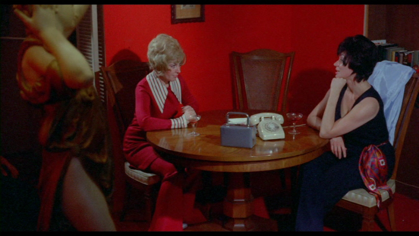 Mark of the Devil and Cry of the Banshee behind our two scene-stealing transvestites (one of them doing her best Holly Woodlawn impression). Though the packaging doesn't mention it, the Vinegar Syndrome release in 2013 is most likely the first uncut release of The Sexualist ever on home video. The prior version on VHS from Alpha Blue ran a paltry 73 minutes and was woefully incomplete, with heavy print damage cutting off several scenes and abbreviating the last scene. That same tattered version popped up on a double feature dedicated to director Kemal Horulu, sharing space with The Virgin and the Lover. The Vinegar Syndrome presentation is such a drastic improvement it's almost mind boggling, transferred from the original camera negative and looking completely spotless. The framing is also improved, balancing out compositions that made little sense in the mostly open matte earlier version. The mono audio is also excellent, and in a nice gesture, the long (and spoiler-filled) theatrical trailer is included along with five minutes of outtakes including "Libra personality" mutual manual stimulation between the Russells and extended couplings from two of the softcore stag film shoots.