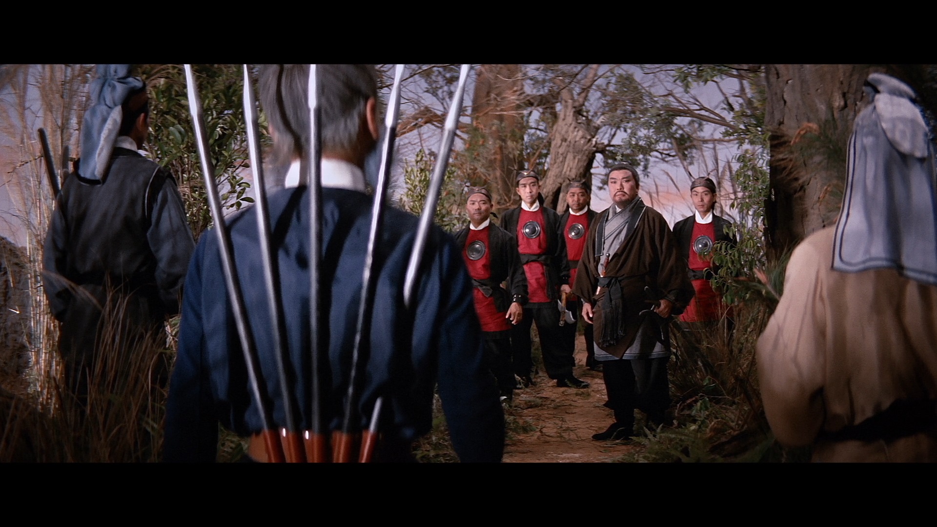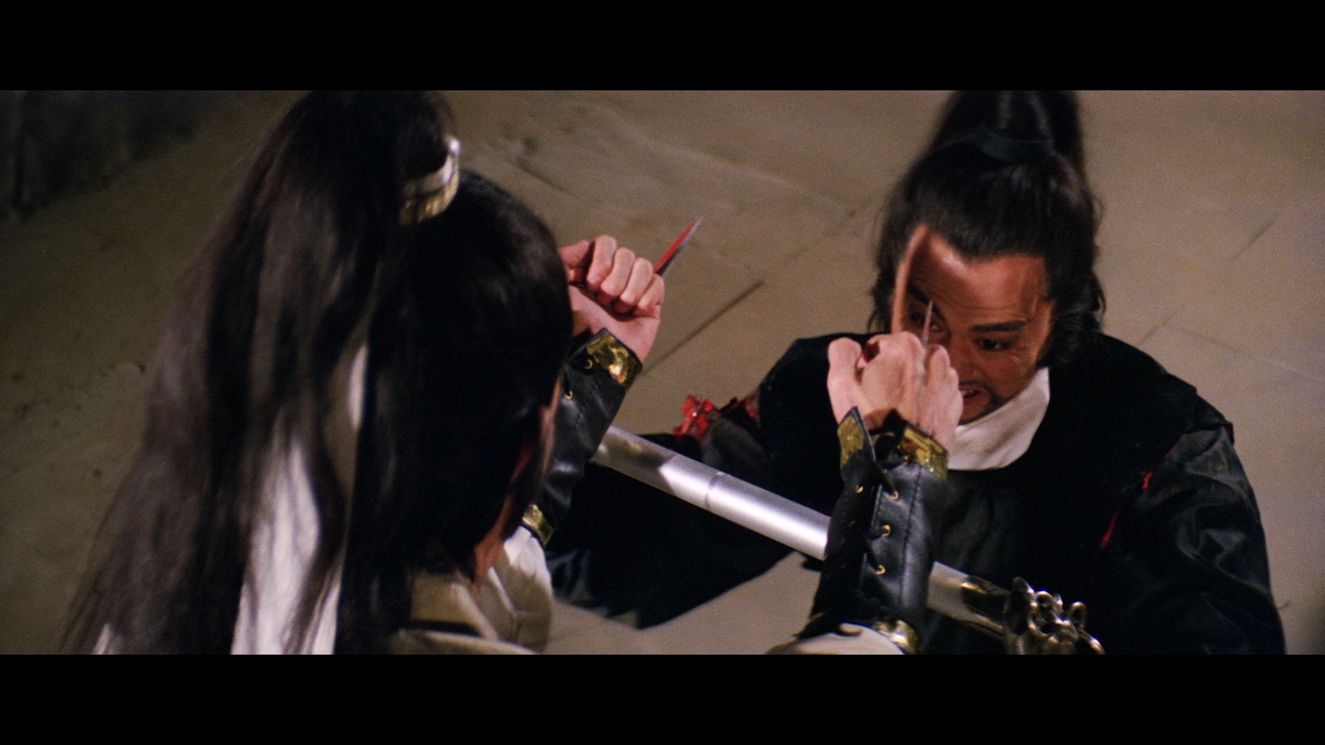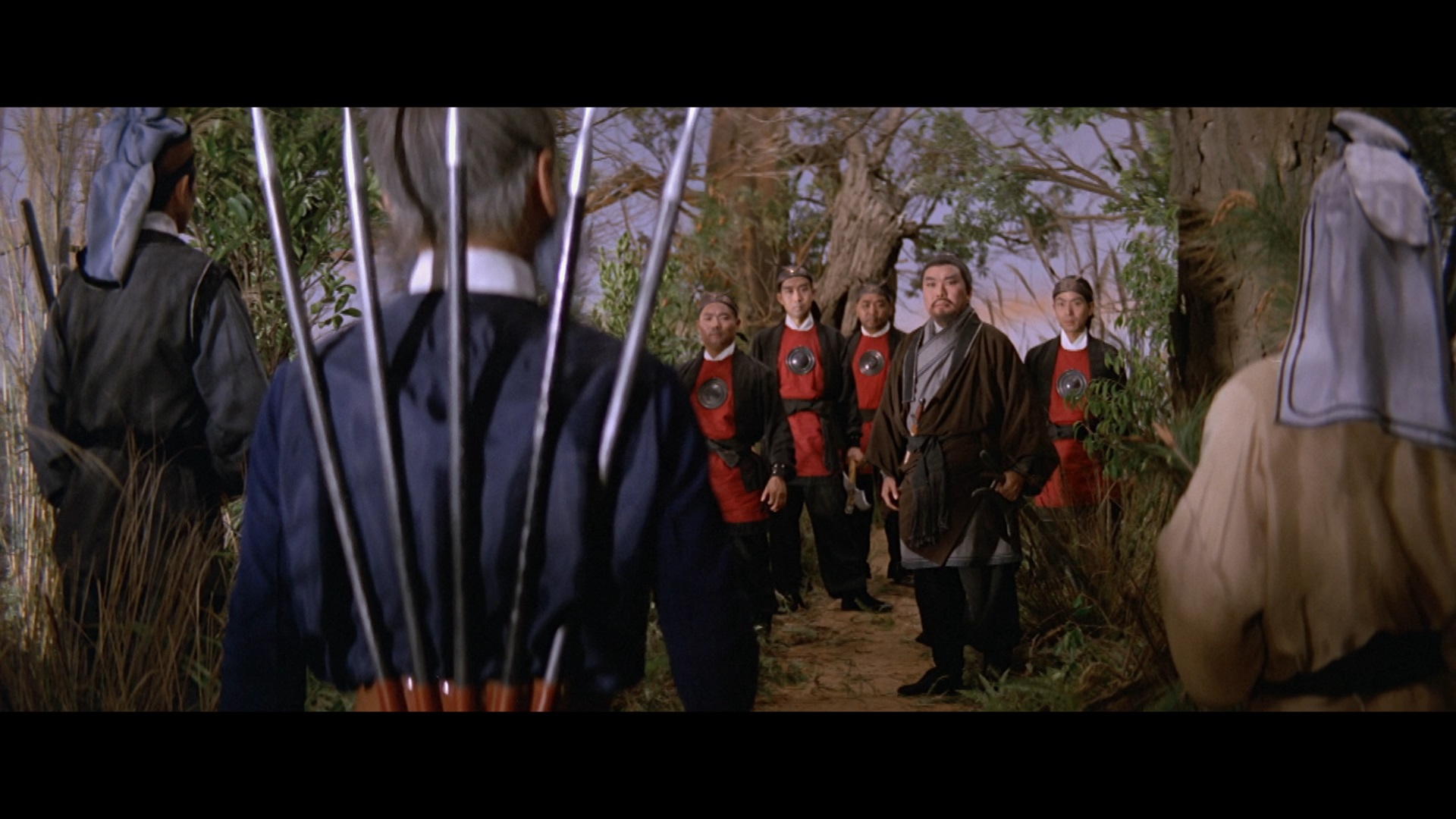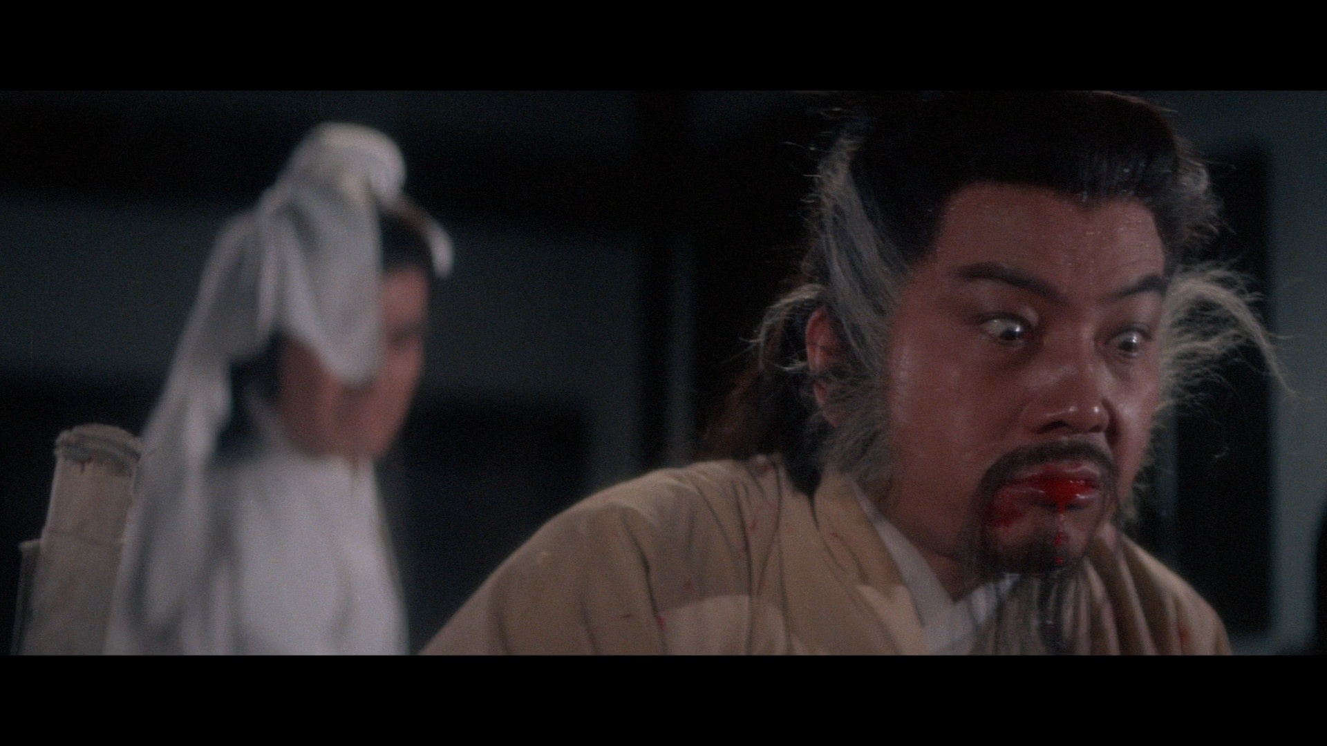 the long interim when the studio's films were off the market (including multiple ones under the very misleading Lightning Kung Fu), this hit Hong Kong DVD and moved on to Blu-ray in both Germany and the U.K., the latter from 88 Films in 2017 featuring English and Mandarin tracks, a Bey Logan commentary, a trailer, and liner notes by Calum Waddell. Here you get another new 2K restoration that improves on prior releases and really shines during the night scenes, which don't have that flat, gray look anymore. The Mandarin and English tracks are also here with better English subtitles, and cementing this film's status as one of the most important in the set, you get three-- three!-- audio commentaries this time, all solo ones by Tony Rayns, Frank Djeng, and Brian Bankston. They obviously all know the material very well and cover all the bases here including the director's background, the shift in wuxia films by this point, the dynamic visual shift here including cross-genre influences, the moral code of our protagonist versus the prior films, trivia about the cast, and the fact that this was a South Korean co-production (including significant location shooting there and multiple cast members). Speaking of which, the disc also includes all of the additional and alternate footage used for the film's radically different South Korean release (34m15s) from the best source, a cropped SD tape master. It's quite different including a very contrasting angle on the main character, but more on that in a moment. Also here are alternate