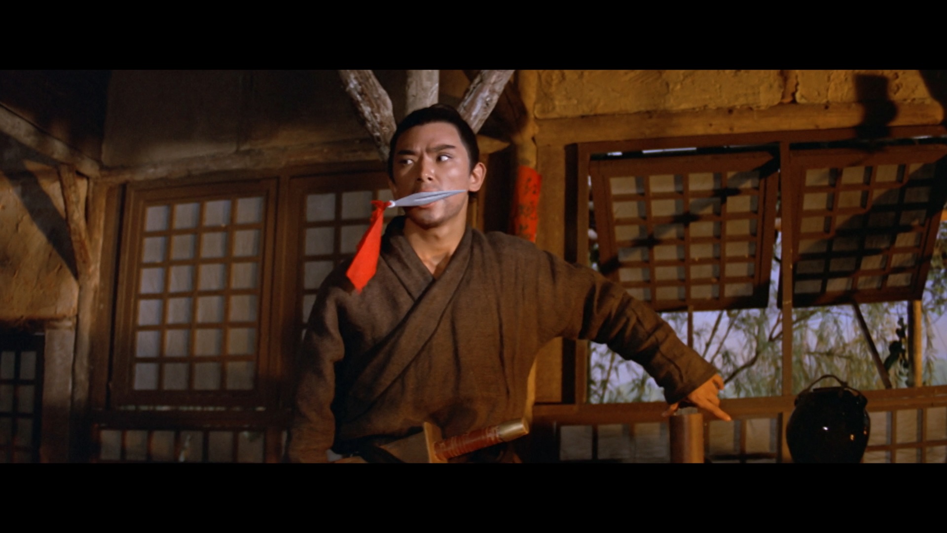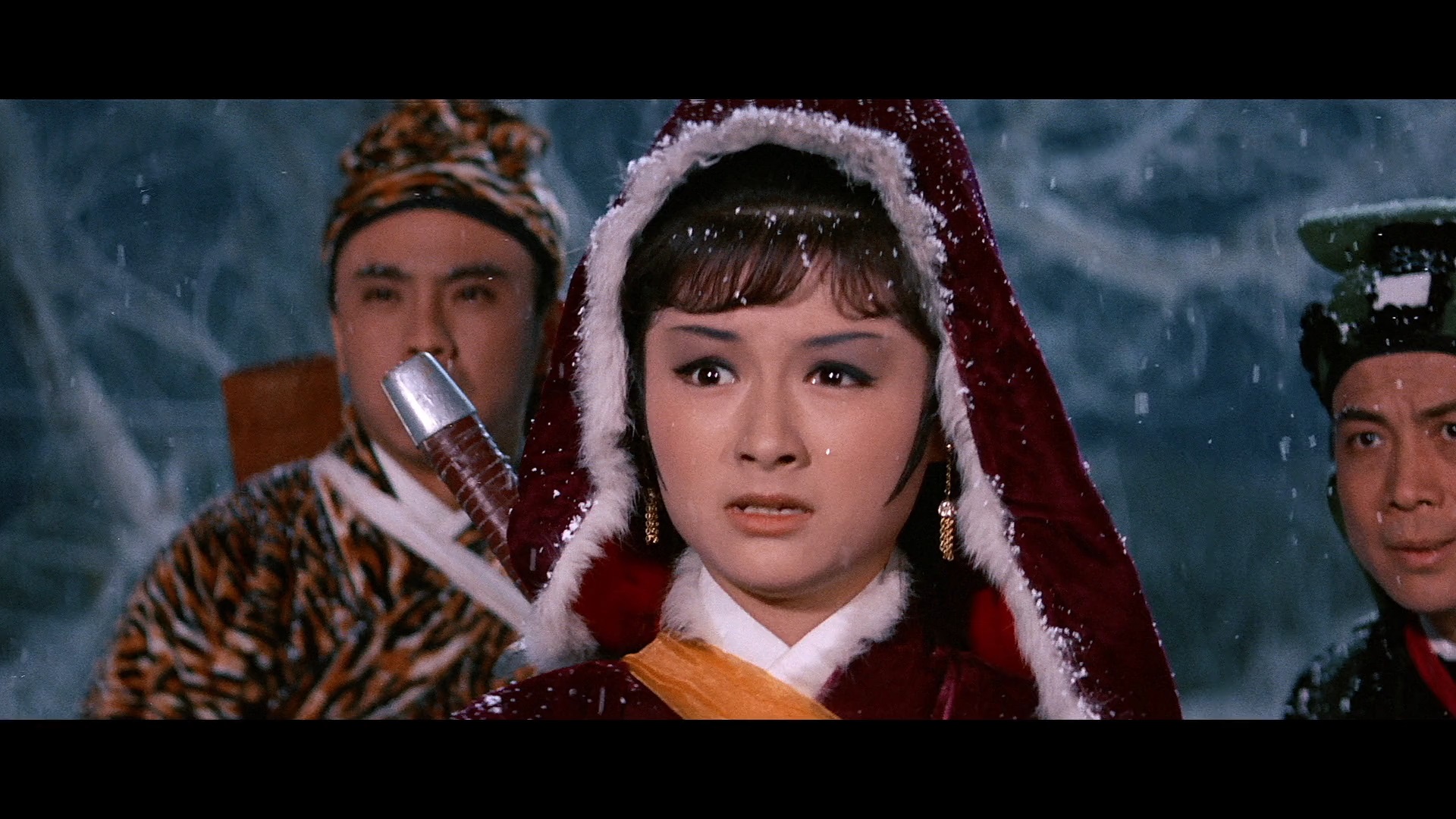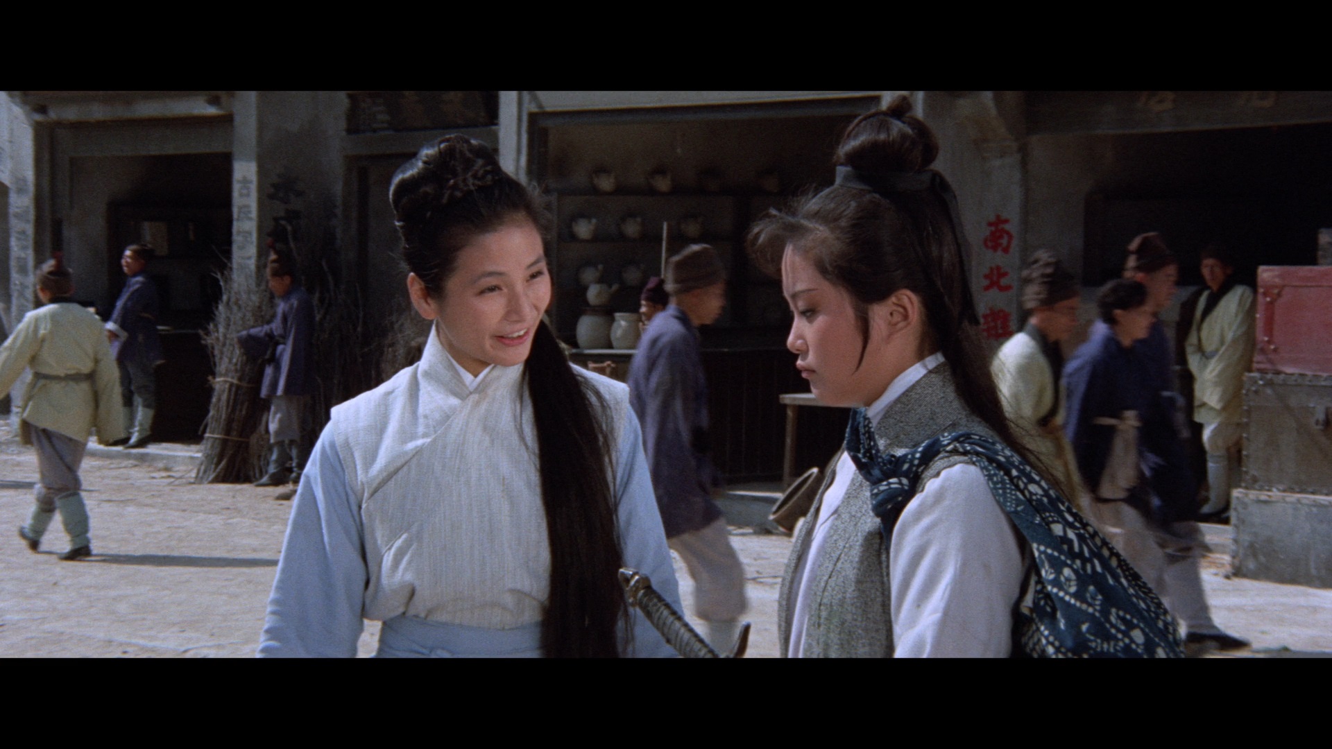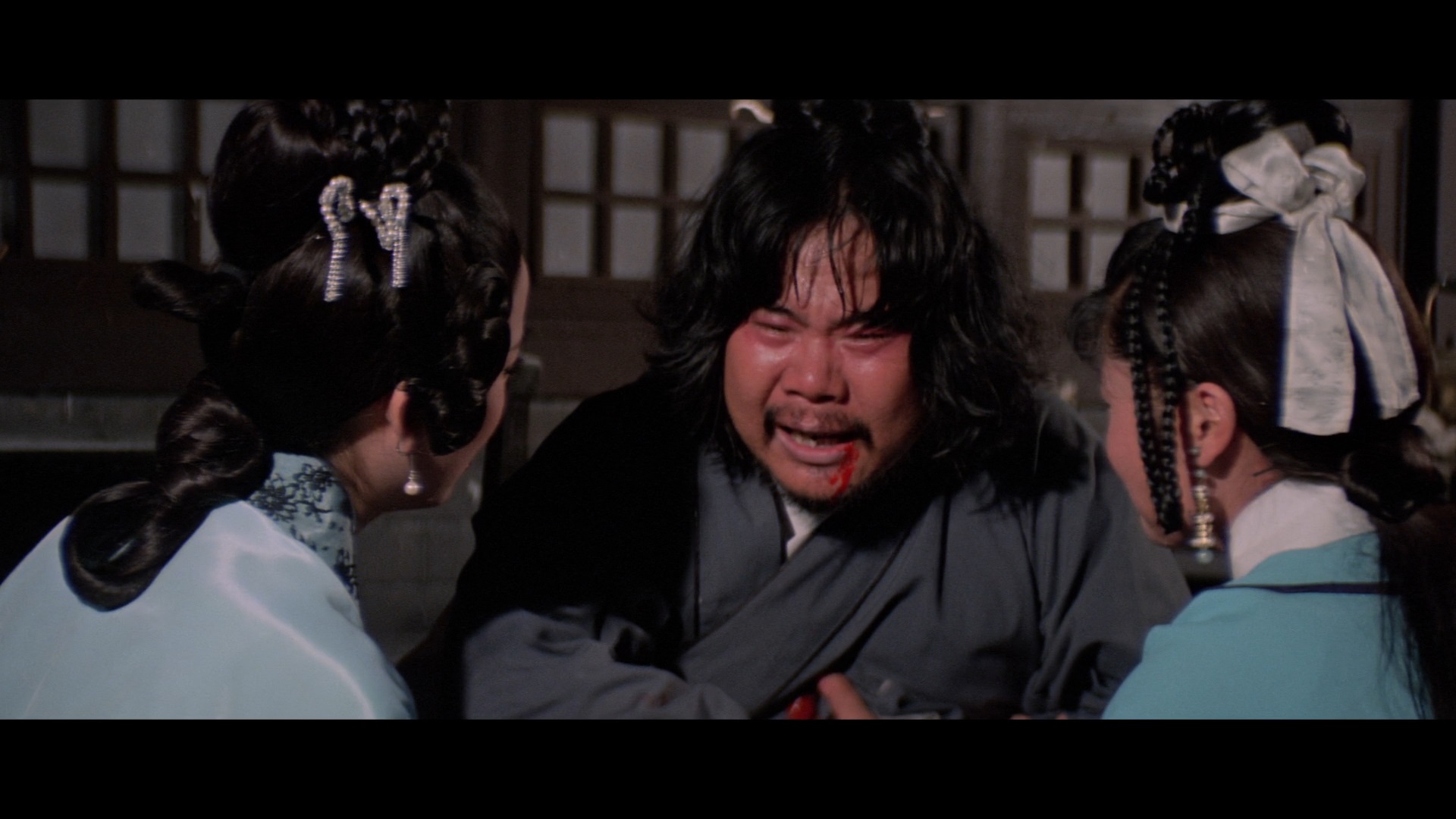 the long interim when the studio's films were off the market (including multiple ones under the very misleading Lightning Kung Fu), this hit Hong Kong DVD and moved on to Blu-ray in both Germany and the U.K., the latter from 88 Films in 2017 featuring English and Mandarin tracks, a Bey Logan commentary, a trailer, and liner notes by Calum Waddell. Here you get another new 2K restoration that improves on prior releases and really shines during the night scenes, which don't have that flat, gray look anymore. The Mandarin and English tracks are also here with better English subtitles, and cementing this film's status as one of the most important in the set, you get three-- three!-- audio commentaries this time, all solo ones by Tony Rayns, Frank Djeng, and Brian Bankston. They obviously all know the material very well and cover all the bases here including the director's background, the shift in wuxia films by this point, the dynamic visual shift here including cross-genre influences, the moral code of our protagonist versus the prior films, trivia about the cast, and the fact that this was a South Korean co-production (including significant location shooting there and multiple cast members). Speaking of which, the disc also includes all of the additional and alternate footage used for the film's radically different South Korean release (34m15s) from the best source, a cropped SD tape master. It's quite different including a very contrasting angle on the main character, but more on that in a moment. Also here are alternate