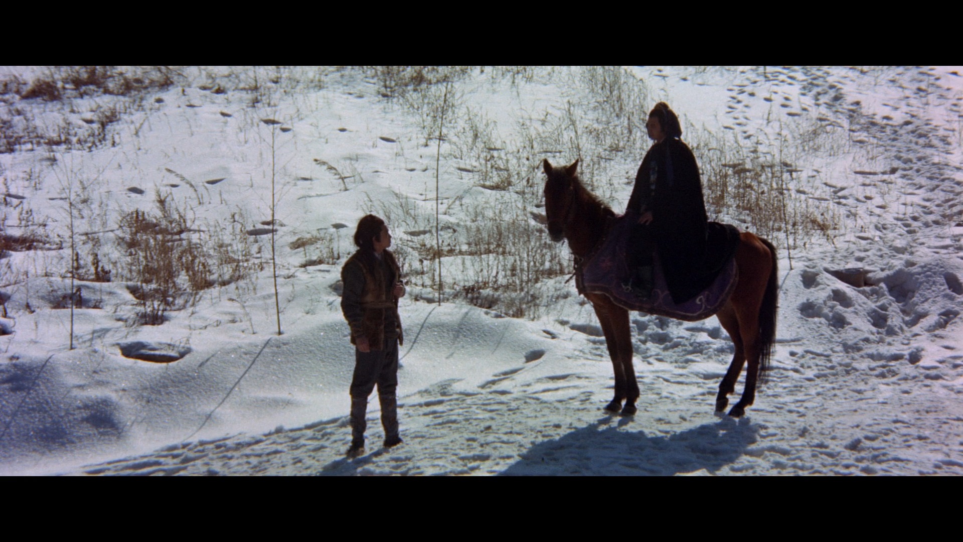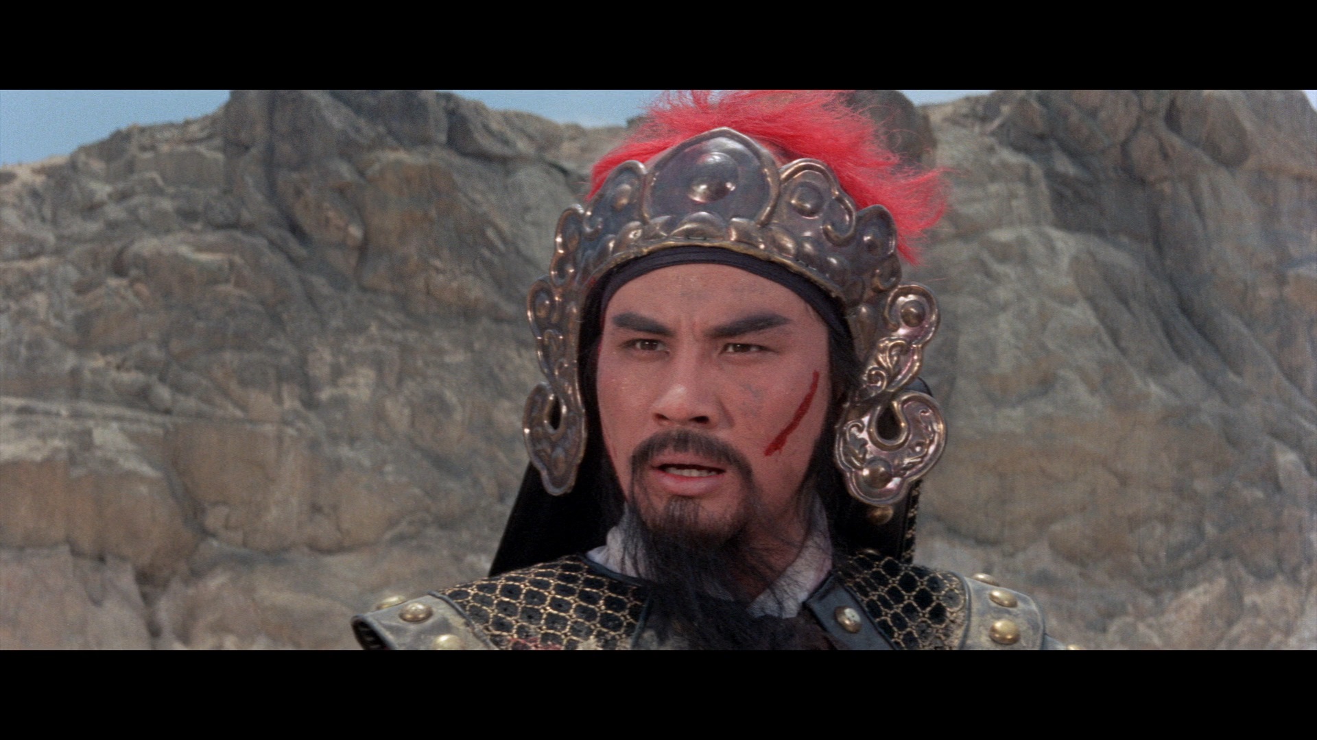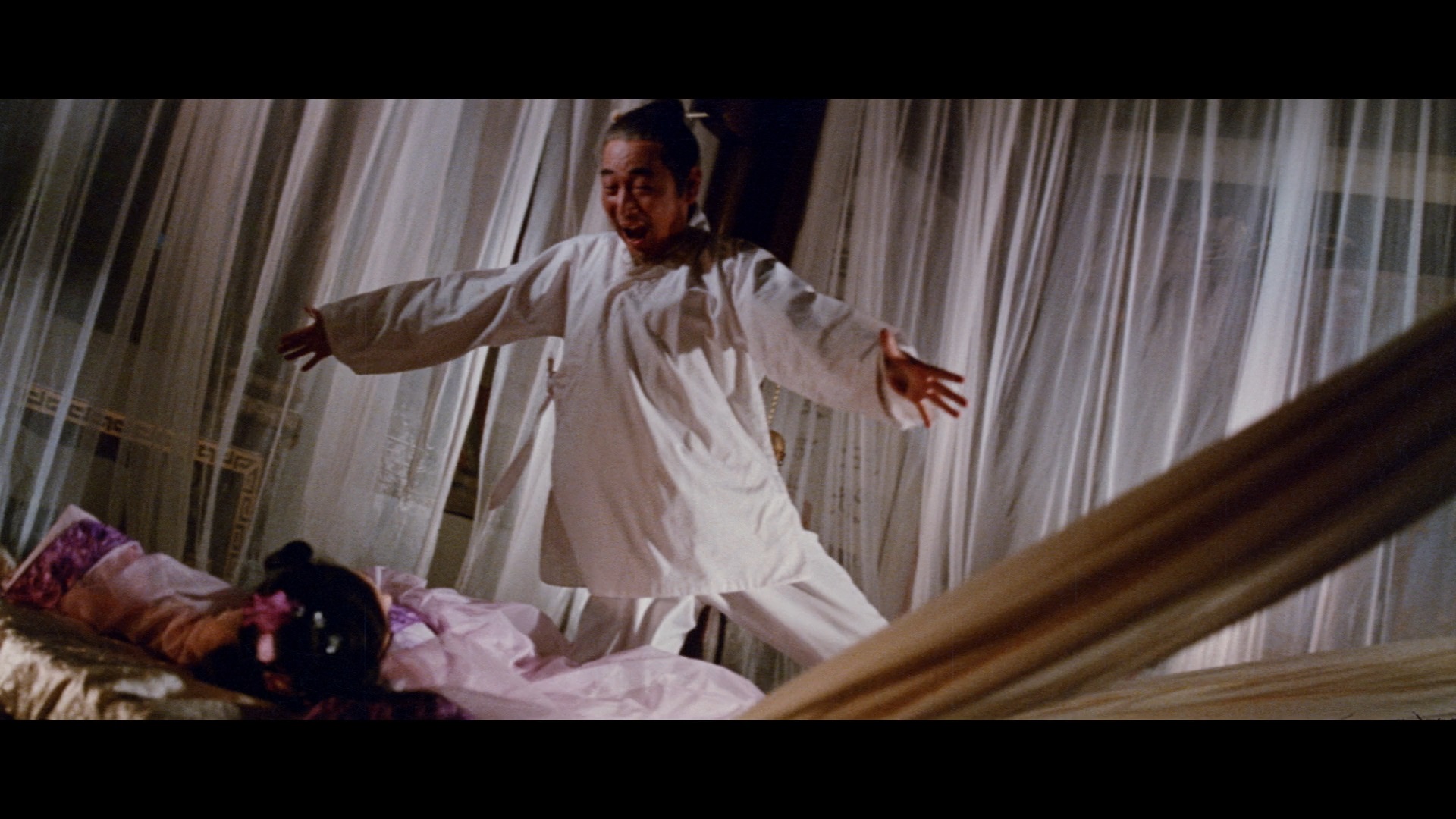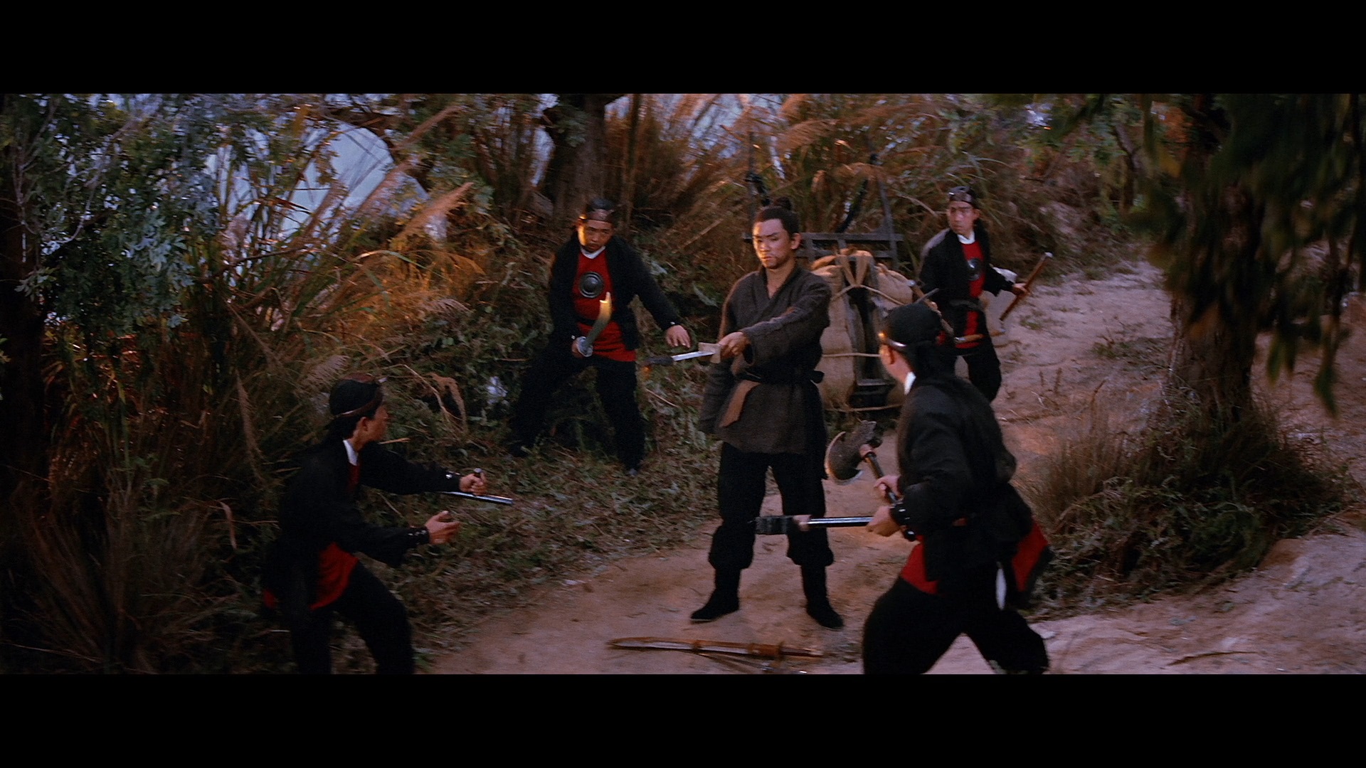 the long interim when the studio's films were off the market (including multiple ones under the very misleading Lightning Kung Fu), this hit Hong Kong DVD and moved on to Blu-ray in both Germany and the U.K., the latter from 88 Films in 2017 featuring English and Mandarin tracks, a Bey Logan commentary, a trailer, and liner notes by Calum Waddell. Here you get another new 2K restoration that improves on prior releases and really shines during the night scenes, which don't have that flat, gray look anymore. The Mandarin and English tracks are also here with better English subtitles, and cementing this film's status as one of the most important in the set, you get three-- three!-- audio commentaries this time, all solo ones by Tony Rayns, Frank Djeng, and Brian Bankston. They obviously all know the material very well and cover all the bases here including the director's background, the shift in wuxia films by this point, the dynamic visual shift here including cross-genre influences, the moral code of our protagonist versus the prior films, trivia about the cast, and the fact that this was a South Korean co-production (including significant location shooting there and multiple cast members). Speaking of which, the disc also includes all of the additional and alternate footage used for the film's radically different South Korean release (34m15s) from the best source, a cropped SD tape master. It's quite different including a very contrasting angle on the main character, but more on that in a moment. Also here are alternate