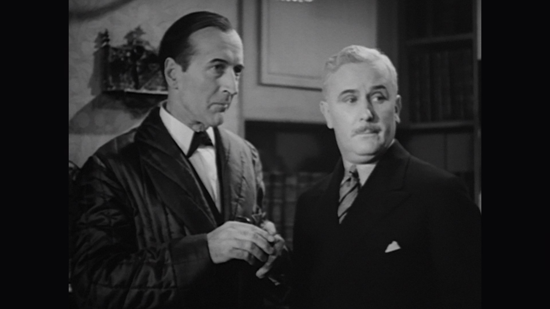 Now it's back to Wontner with 1935's The Triumph of Sherlock Holmes, this time a surprisingly faithful adaptation of The Valley of Fear and arguably the star's best turn in the role. This time Moriarty (Harding, who's quite good) is out in the open and pining to get Sherlock Holmes out of retirement... but how? Moriarty decides to take advantage of "an American society who wishes to remove one of its members," which involves a $50,000 fee, the mysterious death of a man at his estate, regular Holmes character Colonel Moran, and a lengthy flashback involving a gang called the Scowlers. The quality of this one (and the fourth film in the set) is by far the best this has looked on home video, though you should still keep your expectations in check as it's still soft and, given the absence of visible film grain or damage, the recipient of visible noise reduction.