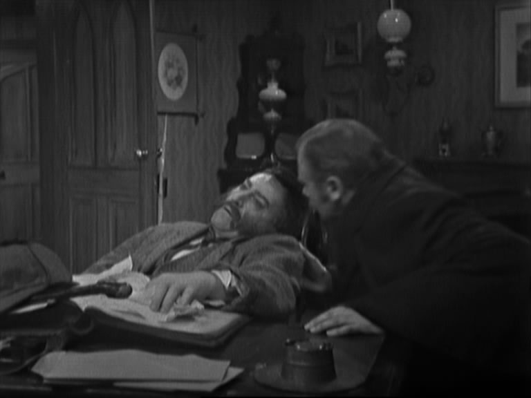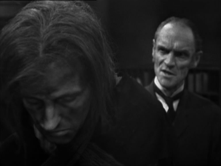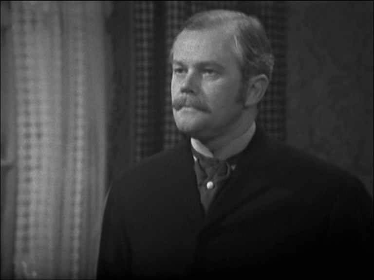 here than usual, and it's a solid rendition of the action-packed original story. In "The Man with the Twisted Lip," Watson is called in to solve a friend's marital problems by infiltrating an opium den where he finds Holmes in disguise, just the first of many peculiar developments involving a missing businessman and the titular character, a beggar who seems to be closely tied to the disappearance. In "The Beryl Coronet," the title object, a valuable crown, is left behind as collateral for a banker (Leonard Sachs) but damaged by his son, whose motives are not quite what they appear to be. The mystery is fairly low stakes in this case, but the finale is atmospheric with Wilmer offering one of his best performances in the series. Another partial reconstruction can be found for "The Bruce-Partington Plans," with Derek Francis (from To the Devil a Daughter, Tomb of Ligeia and several Carry On films) climbing aboard as Mycroft Holmes, who's searching for missing submarine plans tied to the discovery of a dead body along the Underground tracks. In this case, the first 40 minutes have survived, with the remainder existing as an audio recording with photos and script excerpts handling the visual component.