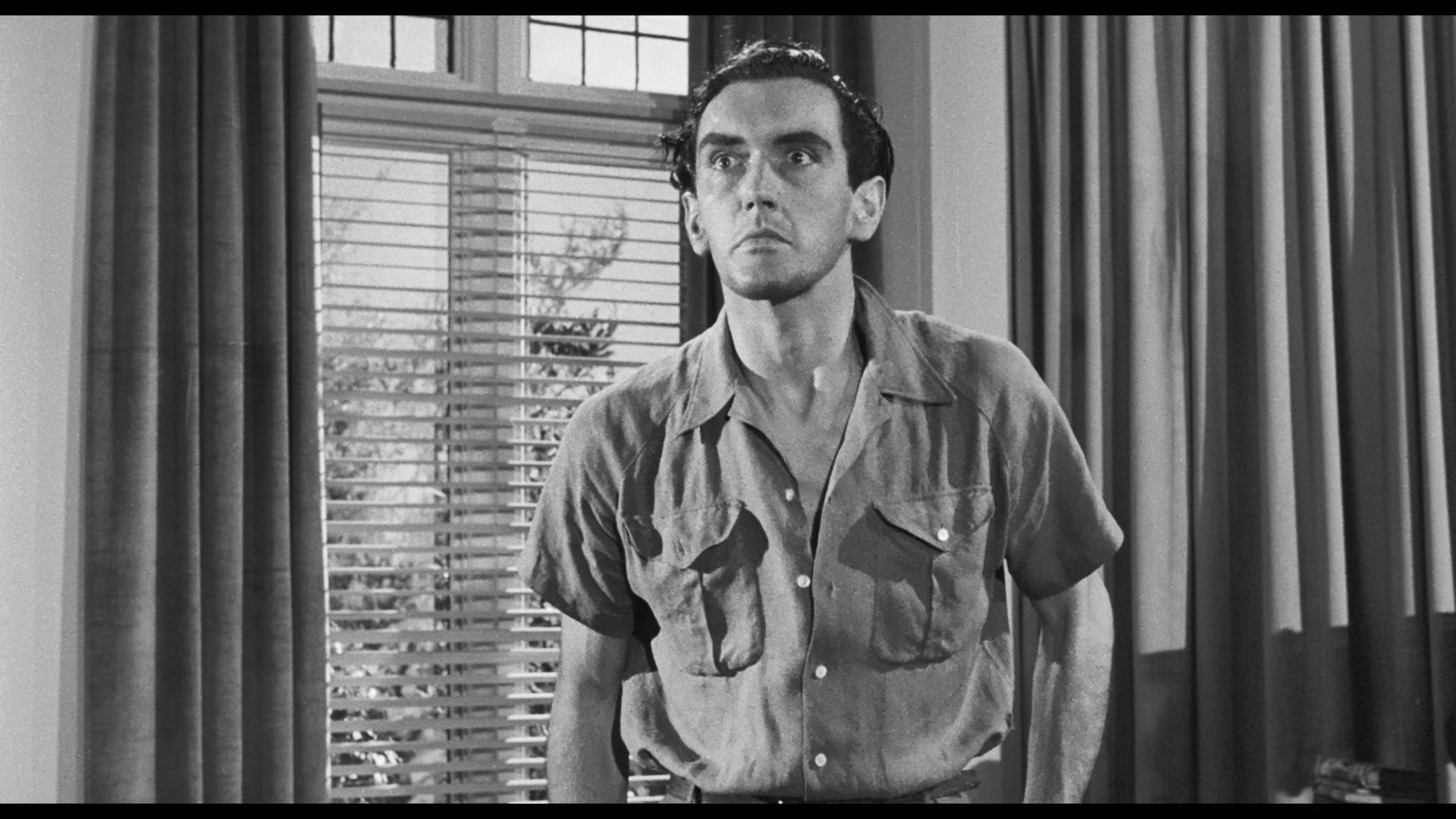 First up on disc one (the black-and-white portion of our program) is some cozy storytelling time with renowned ghost story writer Algernon Blackwood who reads a pair of the only existing tales in the short-form series A Strange Experience, both directed by Anthony Gilkison in 1949: Lock Your Door (14m36s), about a woman undergoing a chilling ride on a faltering train across the countryside, and The Reformation of St Jules (13m31s), in which an innovative skywriting demonstration sets off an inexplicable Short Sharp Shocksincident hinting at forces in the great beyond. Both take place entirely with the author relating the tales in an offhanded, relaxed style ambling around a firelit sitting room, always shot at slightly uncomfortable angles that break away from the standard blocking you normally see with his gaze seemingly fixed on someone elsewhere in the room. It's a peculiar technique that ends up imbuing both stories with a spooky air while offering a chance to see one of the unsung maestros of the form at work long before it would become common practice for other writers and directors in the TV age. On a similar note, 1953's once-lost The Tell-Tale Heart by J.B. Williams (20m39s) for the independent company Adelphi Films features none other than Stanley Baker (Zulu, A Lizard in a Woman's Skin) having a field day as Edgar Allan Poe, relating one of his most famous tales by the light of a flickering candle and building up to an appropriate fever pitch for the legendary floor-ripping finale.