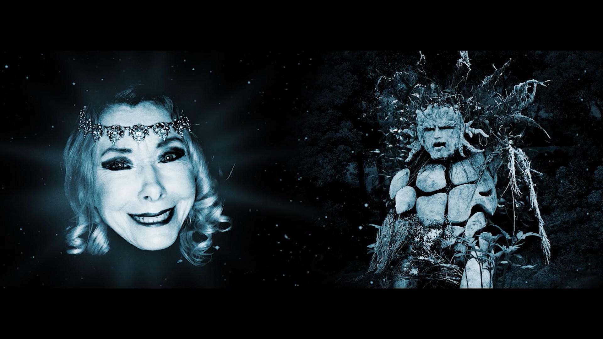 Shot in blue-tinted monochrome, the film looks excellent on the Blu-ray from Carnie Features which comes as a limited edition with a slipcase, three double-sided lobby cards, a booklet with an essay by Darrell Buxton, and reversible artwork. The DTS-HD MA English 2.0 stereo track sounds excellent and comes with optional English SDH subtitles, and you also get a commentary with Rutter and composer Craigus Barry chatting at length about how they put it all together. The "Extra Treats" include a pair of short films from the director, 2017's Bella in the Wych Elm (35m27s) which is essentially from whence this film sprang, and 2018's Dr. Balden Cross: Beyond the Void (31m27s), a nifty little mockumentary presented as a "lost" 1984 TV show. A director interview at the 2023 Festival of Fantastic Films (15m55s) covers the film's origins and anecdotes from the shoots. A cast and crew panel from Horrhiffic 2024 (23m6s) is sometimes difficult to hear but features The Shend, Rutter, Barry, Munro, and Peart explaining how they got involved and what they thought of the final result. Also included are a behind the scenes image gallery (16m57s), a trailer, and a BBC Hereford & Worcester radio report (9m48s). Buy here.