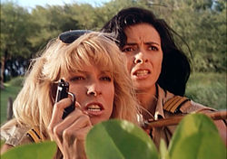 over villain duties as Kane, a crime boss prone to speecifying in front of palm trees. This insidious foe has lined up a team of assassins to take down Donna and Nicole, who spend much time running around in bikinis. That's about it for plot, except that Estrada plays helpful, gun toting agent Richard Estaban, who comes to the girls' aid with an array of ridiculous gadets. Add to that the usual story-stopping sex scenes, sport boating, late hour Russ Meyer starlet Pandora Peaks, and a lot of Vegas and Lousiaina bayou scenery, and you've got the usual recipe for surefire entertainment that won't tax your brain.