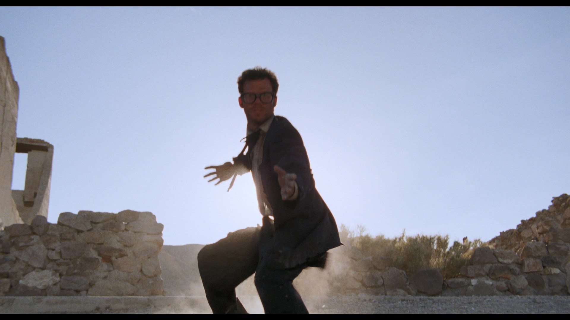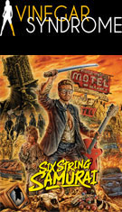 vying to catch on with young arthouse-going moviegoers who had made superstars out of the likes of Quentin Tarantino and Robert Rodriguez, who had made referential moviemaking a new kind of spectator sport in the wake of Pulp Fiction, Reservoir Dogs, and El Mariachi. That meant a lot of films got lost in the shuffle with screens jammed with films like 2 Days in the Valley, The Boondock Saints, Freeway, Killing Zoe, and so on, though all built up admirers to one degree or another. One of the most colorful and eccentric of these was Six-String Samurai, which rode a huge wave of buzz after an ecstatic debut at Slamdance but never quite took off during its release from Palm Pictures (who was really gunning for cult credibility around this time with The Basketball Diaries and Ghost in the Shell). A hodgepodge of references with overt nods to El Topo, The Road Warrior, Lone Wolf and Cub, The Wizard of Oz, and multiple music acts, the film is divisive by nature but has managed to keep up a certain level of fan awareness over the past 23 years in spite of being treated very poorly on video with only a mediocre non-anamorphic release in 1999 representing it on the DVD market. In 2021, Vinegar Syndrome swung the other direction with a vengeance by giving the film a lavish UHD and Blu-ray special