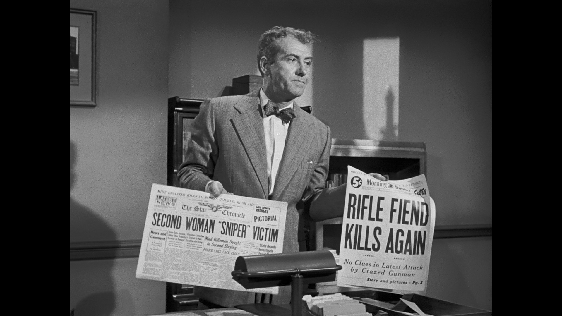 Film number five is one that garnered a hefty amount of buzz in the film community when it first hit DVD back in 2009 as part of the Columbia Pictures Film Noir Classics 1 box. Made by The Stanley Kramer Company and sporting an opening disclaimer that this is a serious look at the "story of a man whose enemy was womankind," this was part of a run of very solid genre films from director Edward Dmytryk that are often overshadowed by the one big dramatic heavy hitter from that period, The Caine Mutiny, as well as his own controversial role in the HUAC hearings as one of the Hollywood Ten after which this film marked his comeback of sorts. What we have here is essentially the granddaddy of the sniper attack movie, something that would become more familiar later with films like Targets and TV's The Deadly Tower (both inspired to different degrees by Charles Whitman's 1966 shooting rampage in Austin, Texas). In fact, Harry Novak even engineered a scuzzy semi-remake of this film as Zero In and Scream, which would make for a very weird and queasy double feature.