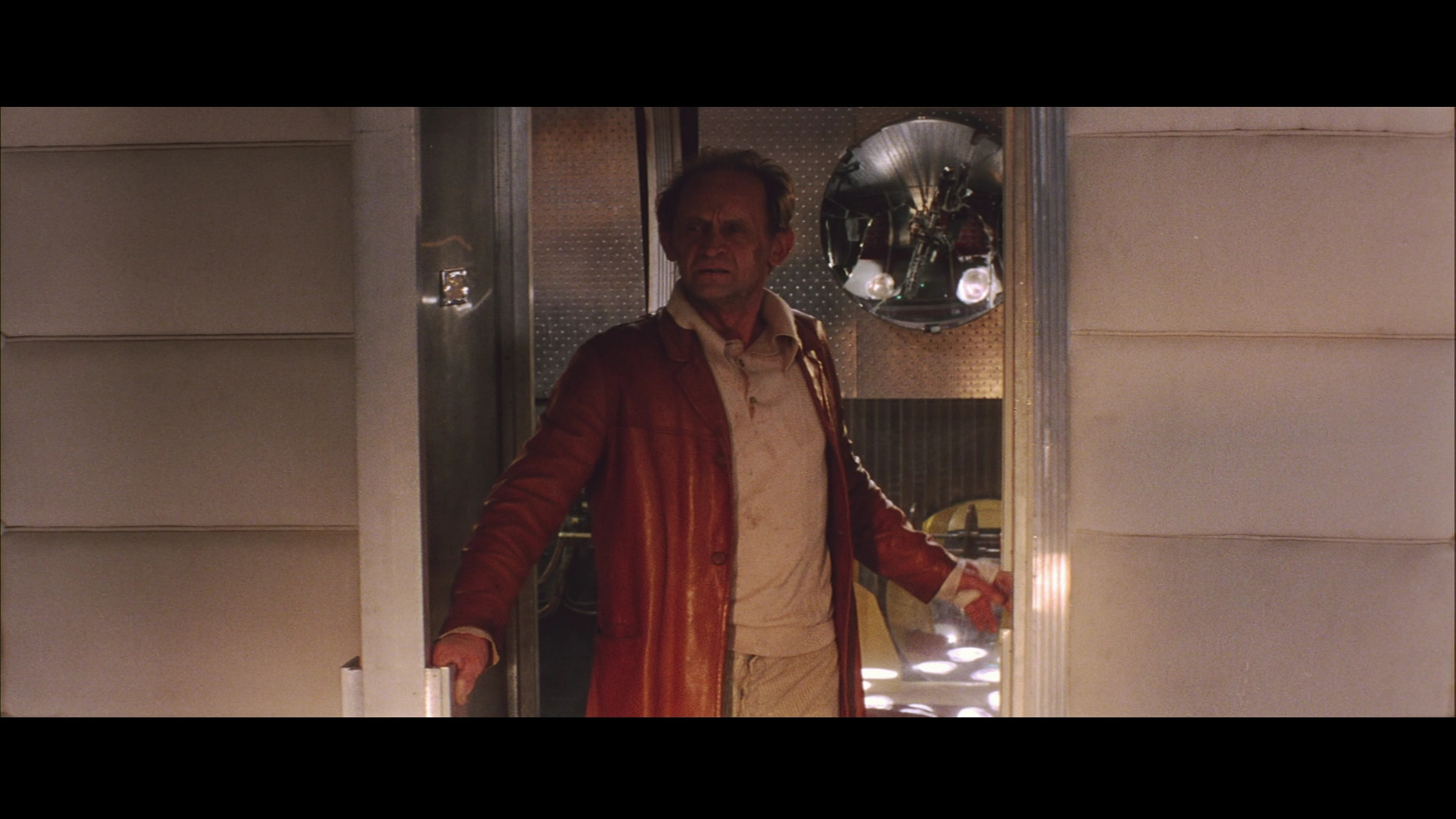 standard def counterparts by a tremendous margin. The amount of detail is a welcome leap forward and perfectly captures the feel of watching the film in 35mm, with extremely fine grain giving it that distinctive '70s sheen. Click on any of the images in this review for an idea of how much better this looks in 1080p; it's really something special, right from the deep green and finely detailed foliage in the opening shots. Some extremely fine, tiny scratches pop up around the 74 minute mark, but considering standard def wouldn't have even revealed them at all, it's barely worth noting. What's also fascinating about this version is the restoration of the color tinting to the black and white sequences, which now alternate between a blue tint (used for the majority of the footage) and a pale, steely lavendar (some of the freeway shots). The previous Ruscico and some other video versions displayed the tints in varying degrees of intensity, while many theatrical prints did not; the film's cinematographer initially said back in 2002 that the footage was shot monochromatic and intended to be left that way, but as one restored shot during the freeway scene proves here, that isn't possible as the gradually escalating purple slowly blooms into full color. It's a powerful effect and nice to have here again. For fans of this film, it's certainly worth an upgrade; for newcomers, there's no better way to make the acquaintance of this challenging but deeply rewarding film.
