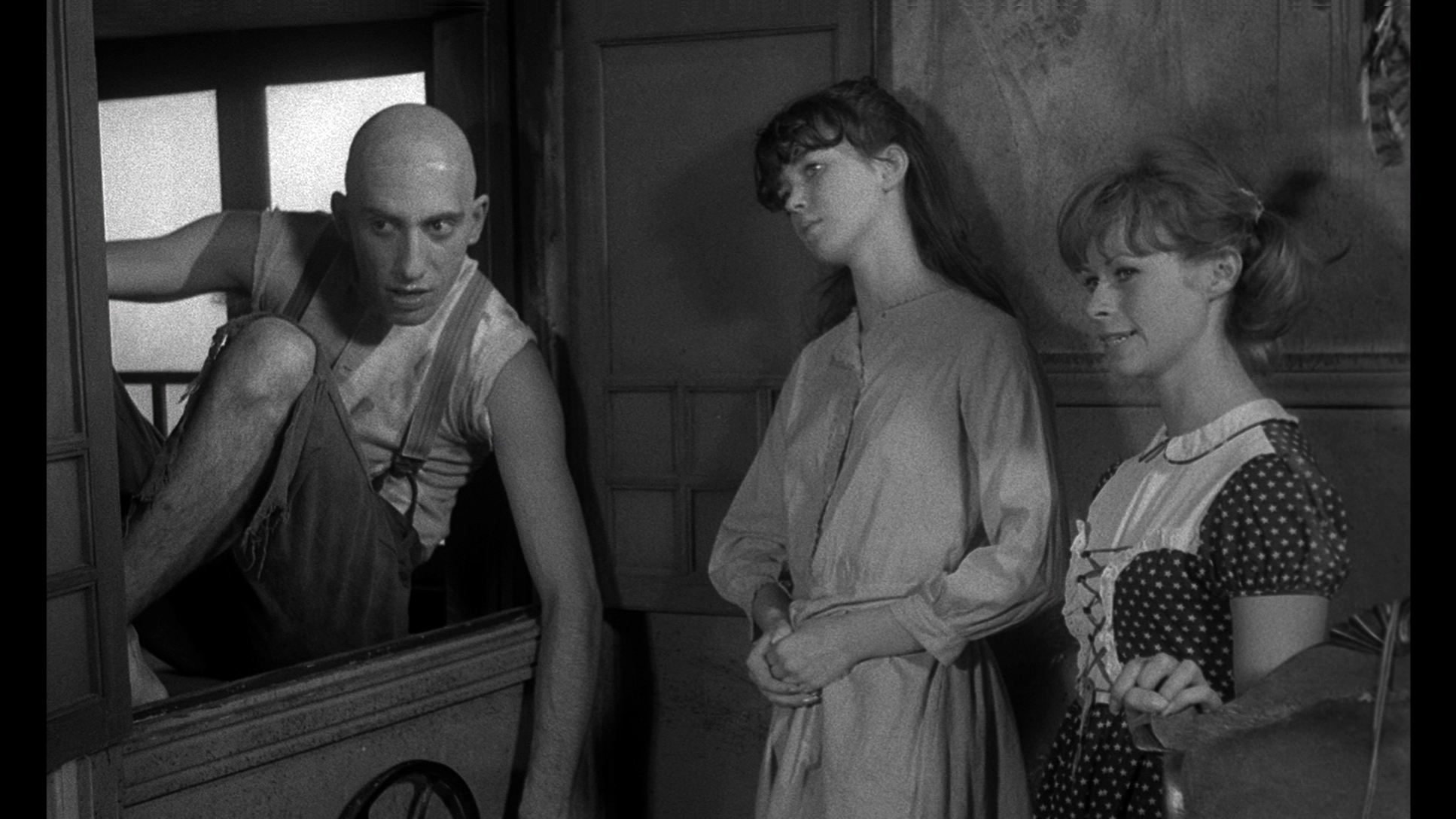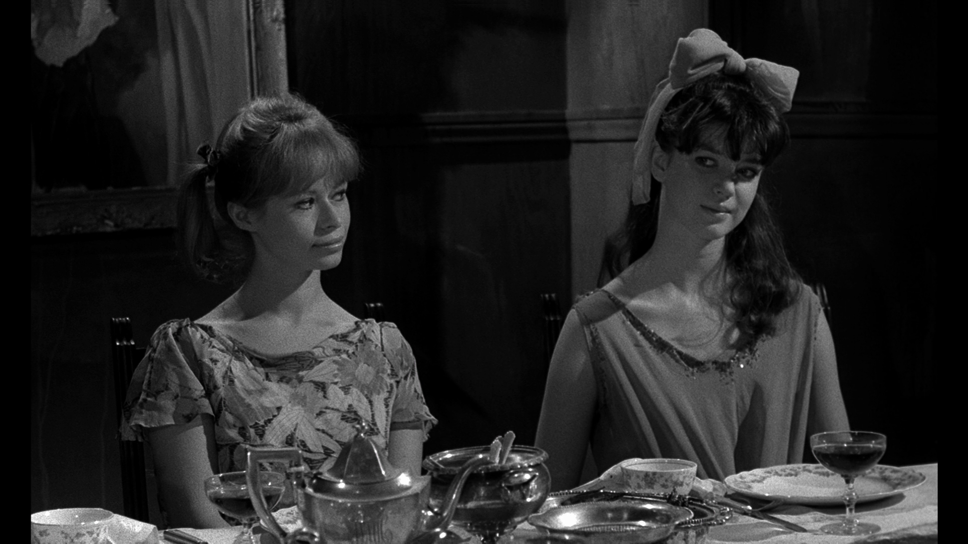 Though superficially similar to some of Charles Addams' drawings, Spider Baby truly resembles nothing else in film. Chaney stars as Bruno, the family chauffeur for the Merrye clan. It seems the Merryes have been plagued for generations by "the Merrye syndrome," a degenerative condition of the mind and body which causes physical deformity and homicidal mania. The eldest son, Ralph (a hilarious Haig), teeters on the brink of being locked away with his older relatives who now reside out of sight in the family basement, while the younger daughters, Elizabeth (Washburn) and Virginia (Banner), a great and deeply unsettling comedy horror pair if there ever was one, take amusement in torturing and murdering the occasional visitor. Two distant relatives, Peter (Redeker) and Emily Howe (Ohmart), come to pay a visit with their family lawyer, Mr. Schlocker (Schanzer), and his secretary, Ann (Dementia 13 heroine Mitchel). When the visitors decide to stay for dinner, Ralph obliges by catching and preparing a cat for the main course, and while we wouldn't dream of giving away the title, let's just say the girls aren't too happy when Schlocker squashes a spider at the dinner table.