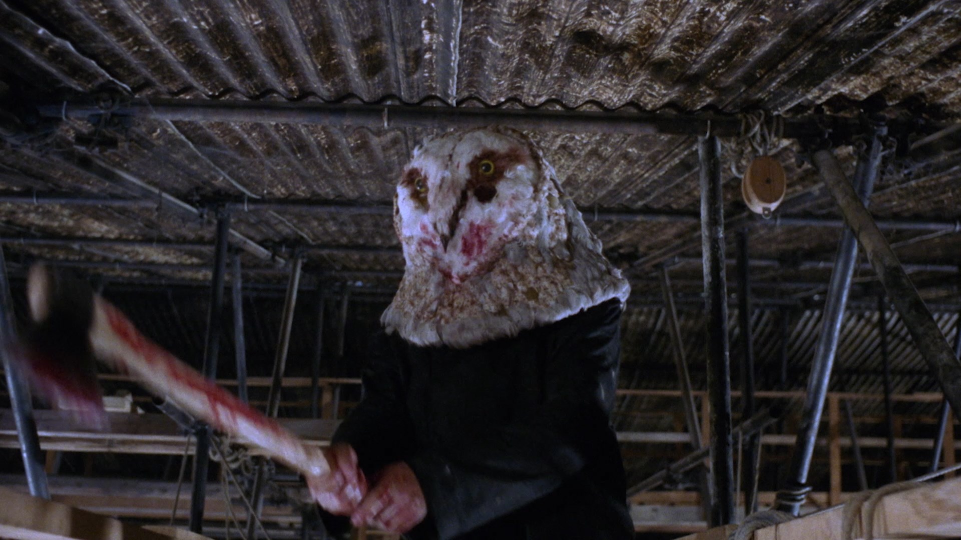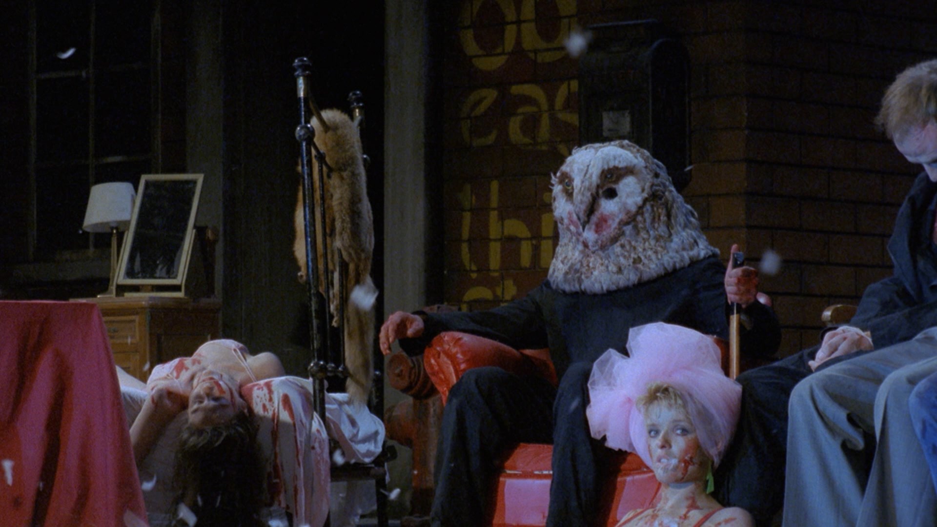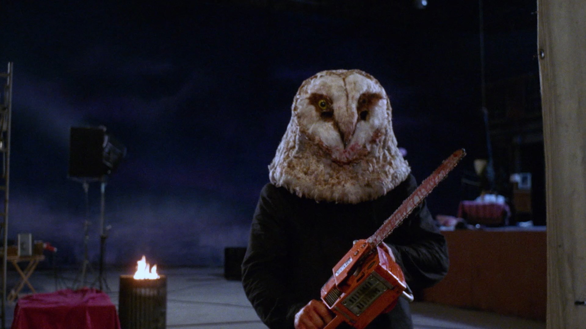 A cavernous theater at night is the setting for the rehearsals of The Night Owl, a macabre pop musical directed by the opportunistic, craven Peter (Brandon). When leading lady Alicia (Cupisti, Soavi's real-life girlfriend at the time) injures her ankle, she's taken to a nearby clinic that turns out to be an institution for the criminally insane. After a bit of bandaging, it's time to head back to the theater -- with an extra passenger in tow, an escaped patient and notorious actor/serial killer named Irving Wallace who quickly dispatches the wardrobe mistress outside the theater. Peter seizes the opportunity to lock the entire cast and crew in for a marathon overnight rehearsal Stage Frightto StageFrightcapitalize on the crime and turn the play's nameless killer into Wallace himself. Of course, the madman is already inside with them, and,sporting the eerie owl mask from the play, he stabs one actress to death on stage in front of the stunned onlookers. With the sole key to their escape hidden away, they fight to survive as Wallace turns to a number of power tools and other vicious implements to pick them off one by one.