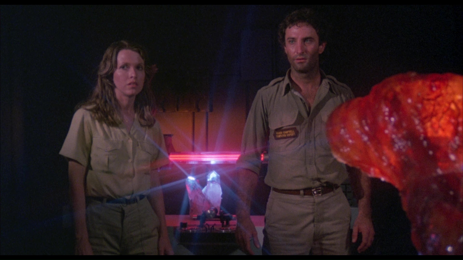 Given a sparse theatrical release with a bizarre poster featuring a sharp-fanged beast unlike anything in the actual film, Star Crystal hit VHS from New World as a video store perennial in the late '80s and then hit the LP-speed bargain tape circuit from Starmaker (like most other New World titles of the era). Needless to say it never burned up the rental charts with people generally confused by its threadbare production values, lack of common sense, and aesthetic far closer to a student film than a legitimate professional production. However, that shoddiness is also part of its weird charm if you're in a forgiving mood (or just want a really daffy space