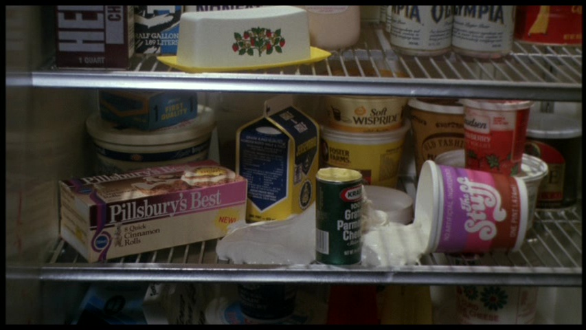 In keeping with common Cohen practice, The Stuff was shot open matte but framed for and presented at 1.85:1 in theaters -- that is, all thirty or so theaters that actually showed it. The film did much better on video, where its unforgettably gross (and misleading) cover art lured in plenty of '80s splatter fans. Anchor Bay's DVD released in 2000 contains the original poster artwork, which misleadingly implies that the stuff eats up its victims from the inside. The matted transfer here looks much better than the old VHS tapes, obviously. The animated menus designed like a commercial for The Stuff are terrific, as is the phony public service announcement trailer. Exclusive to this release is a Cohen commentary track, which increases one's appreciation of the film immensely as he rattles off anecdotes involving everything from Teamsters to Moriarty's hairpieces. He also points out a number of actors from his other films, including a supermarket cameo from Special Effects' Eric Bogosian. Though he tends to repeat himself quite a bit, he keeps things making at a fast clip and proves to be just as witty as his infamous off-kilter dialogue. He also reveals that Morris was not quite, um, himself when they shot the film and reveals the original actor he wanted for the role. Incidentally, Jason's brother is played by the actor's real life sibling, Brian Bloom, who went on to become a TV star on Bandit and appeared in the New Horizons horror film Knocking on Death's Door.